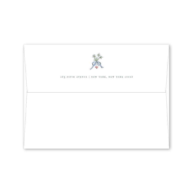 Each invitation comes with a blank inner and outer envelope and return address printing on the outer envelope flap. Envelope liner and recipient address printing for each envelope may be purchased for an additional cost on the main collection page.