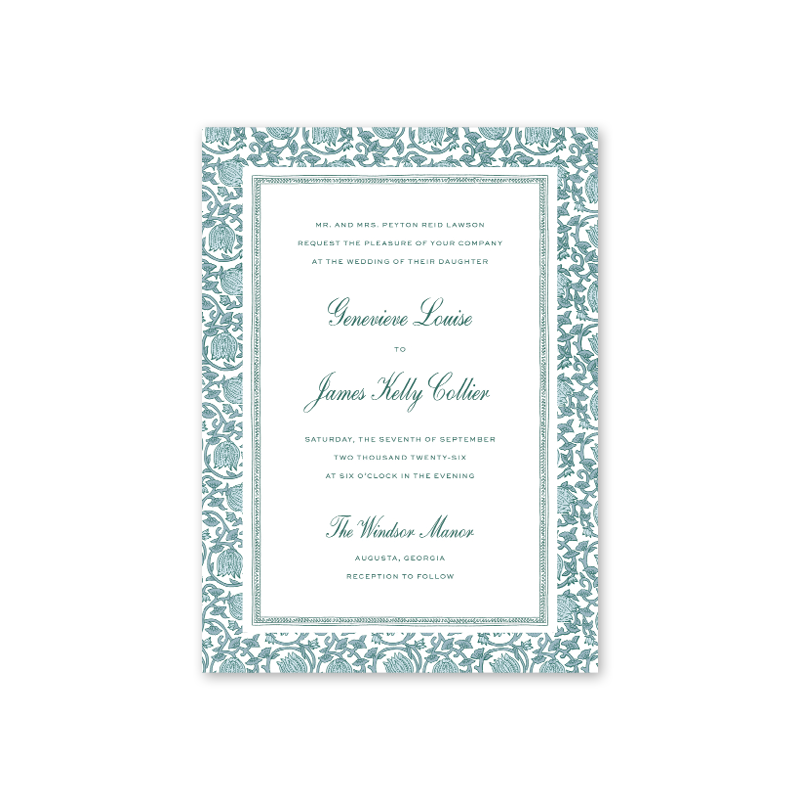 Each invitation comes with a blank inner and outer envelope and return address printing on the outer envelope flap. Envelope liner and recipient address printing for each envelope may be purchased for an additional cost on the main collection page.