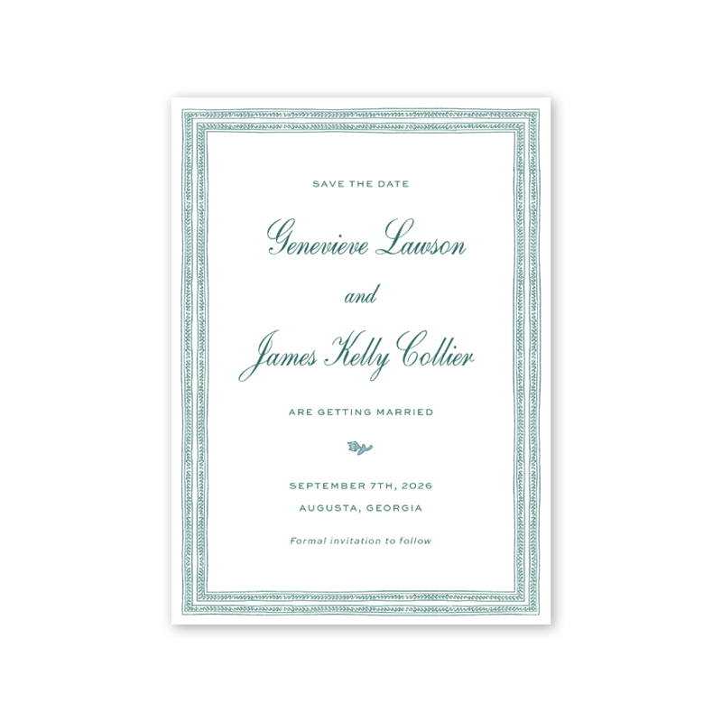 Select your order quantity from the dropdown menu below and check your total. Enter the text for your Save the Date in the “Note” box below. Click Add to Cart. Your wording does not have to match the sample product wording and can be customized for your Save the Date. You will receive a proof notification via email and text message within 3 to 5 business days.If your Save the Date includes a photo, please email a high resolution image along with your order number to weddings@dogwood-hill.com.