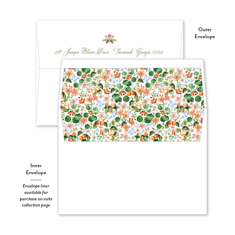 Each invitation comes with an inner and outer envelope and return address printing on the outer envelope flap. Envelope liner may be purchased for an additional cost on the main collection page.
