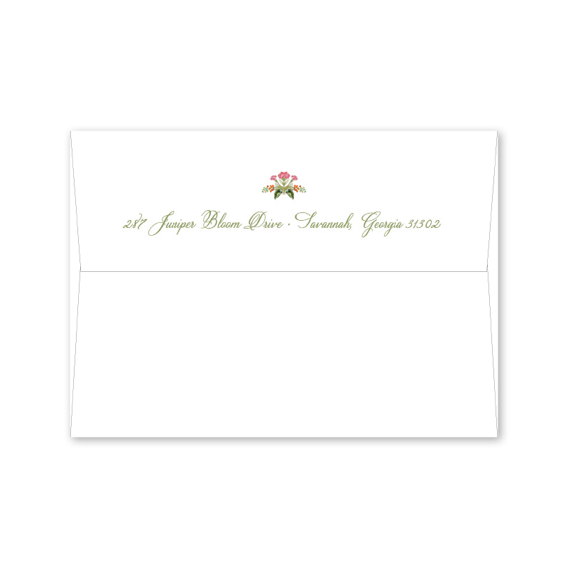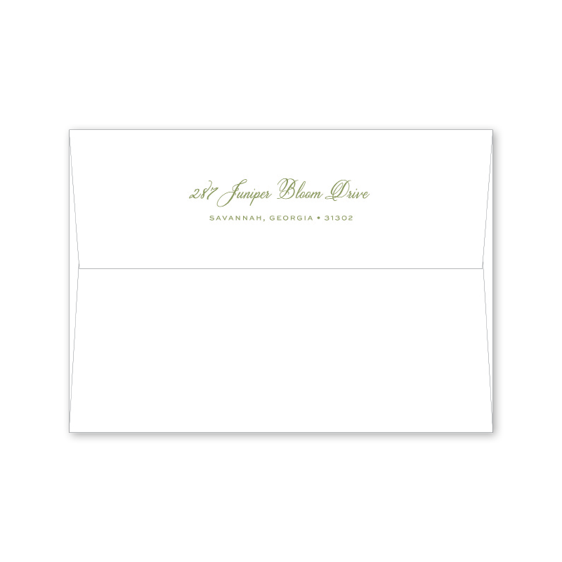 Each invitation comes with a blank inner and outer envelope and return address printing on the outer envelope flap. Envelope liner and recipient address printing for each envelope may be purchased for an additional cost on the main collection page.