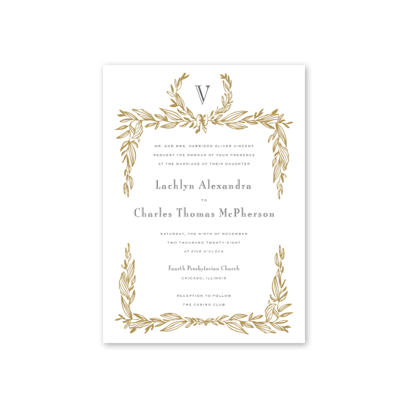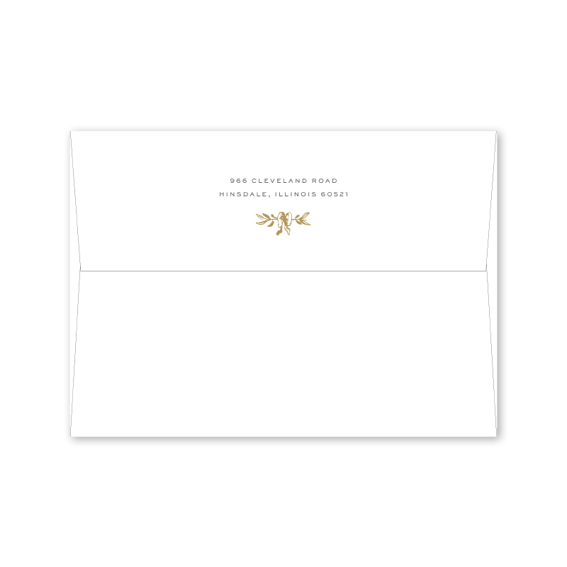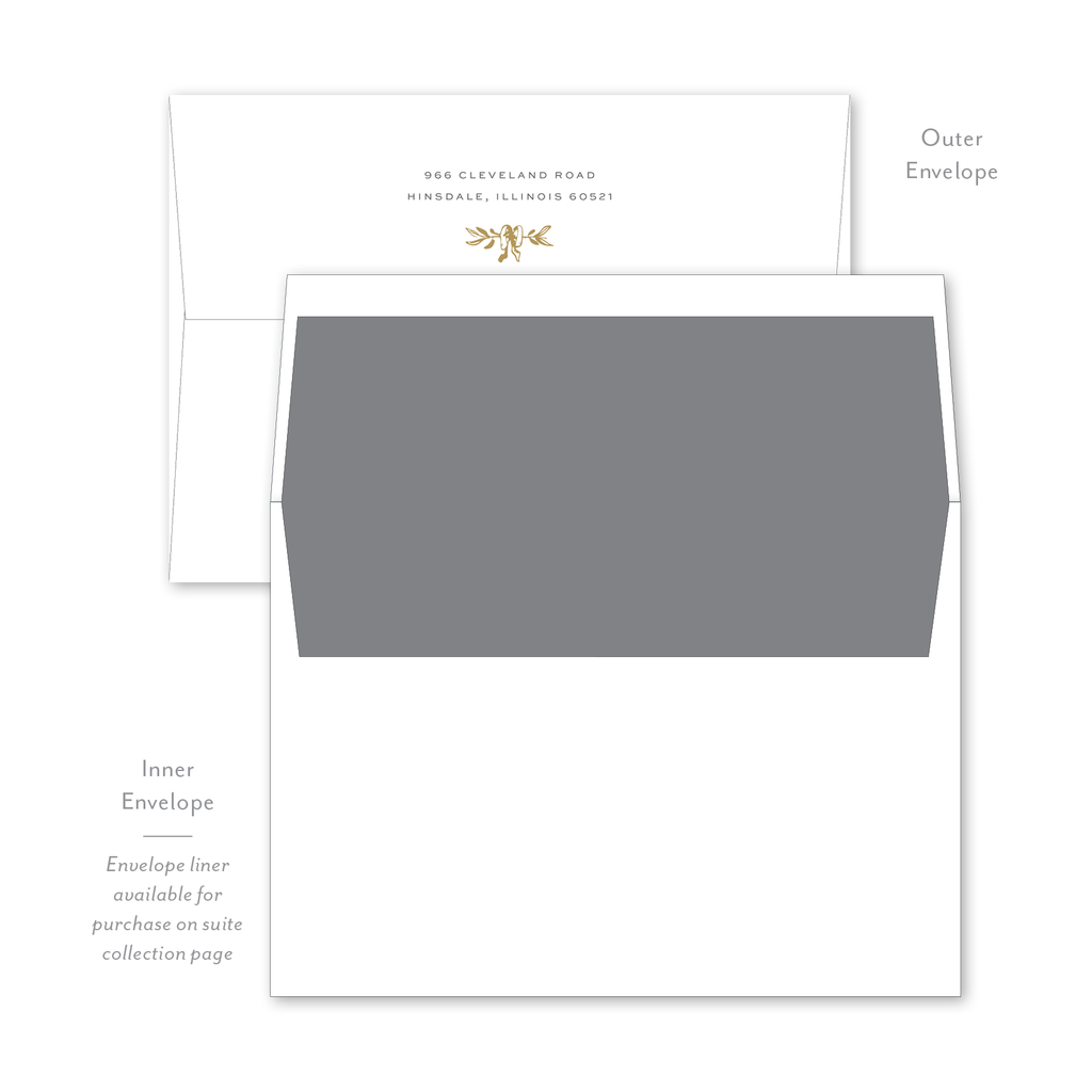 Each invitation comes with a blank inner and outer envelope and return address printing on the outer envelope flap. Envelope liner and recipient address printing for each envelope may be purchased for an additional cost on the main collection page.