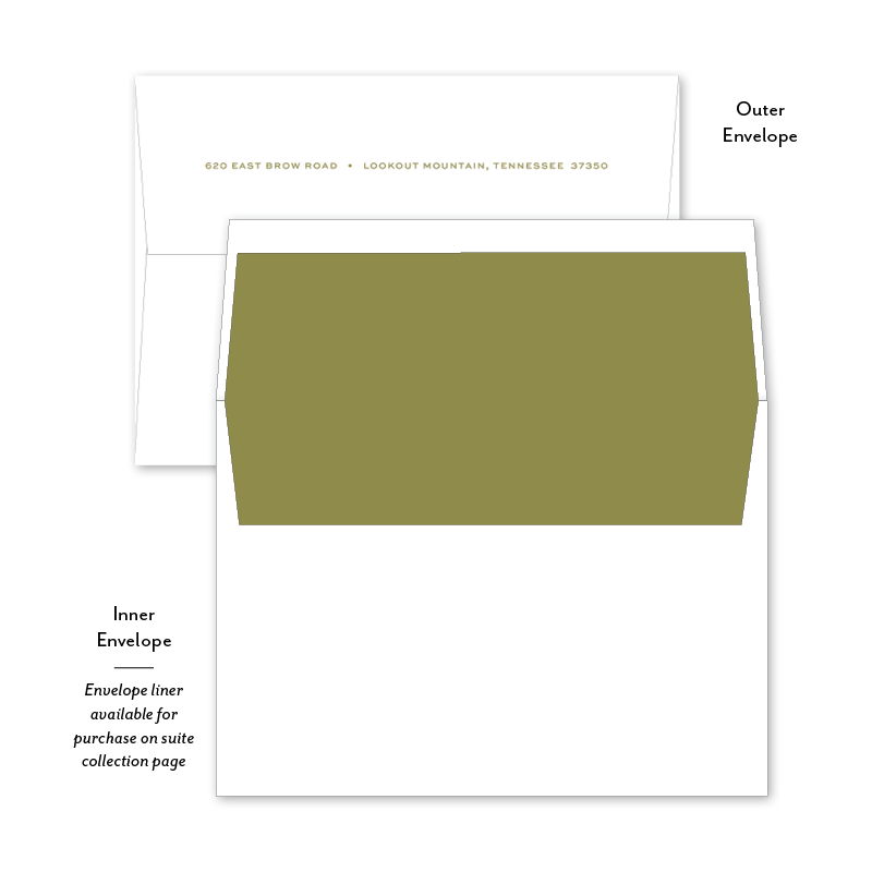 Each invitation comes with a blank inner and outer envelope and return address printing on the outer envelope flap. Envelope liner and recipient address printing for each envelope may be purchased for an additional cost on the main collection page.