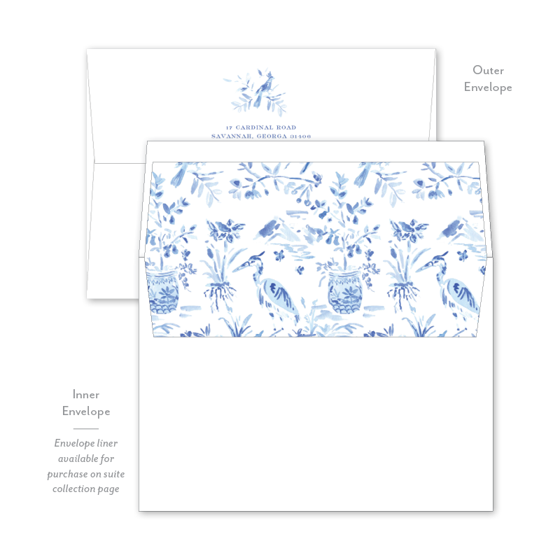 Each invitation comes with an inner and outer envelope and return address printing on the outer envelope flap. Envelope liner may be purchased for an additional cost on the main collection page.