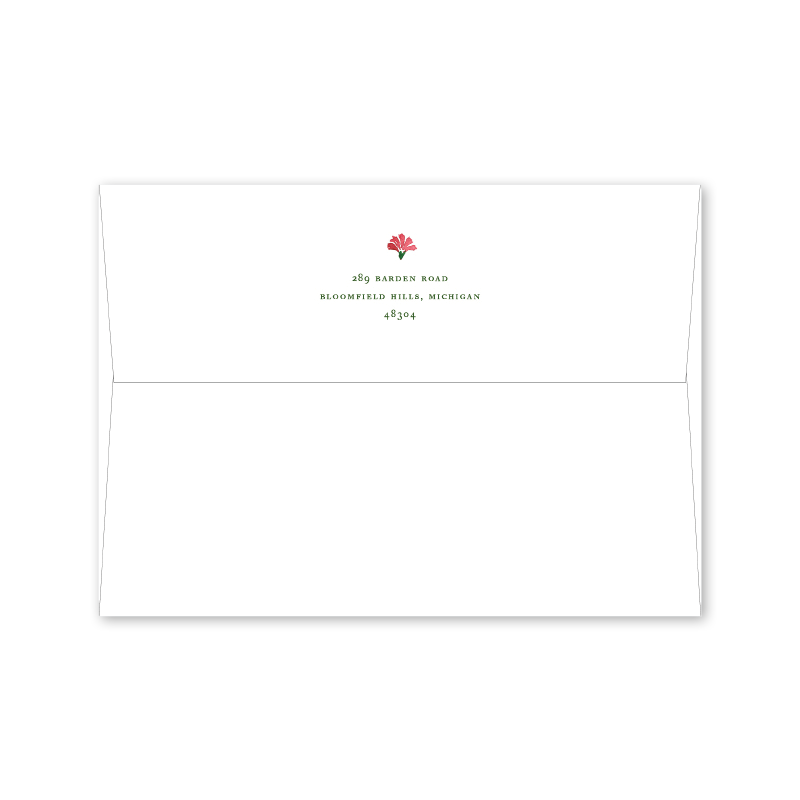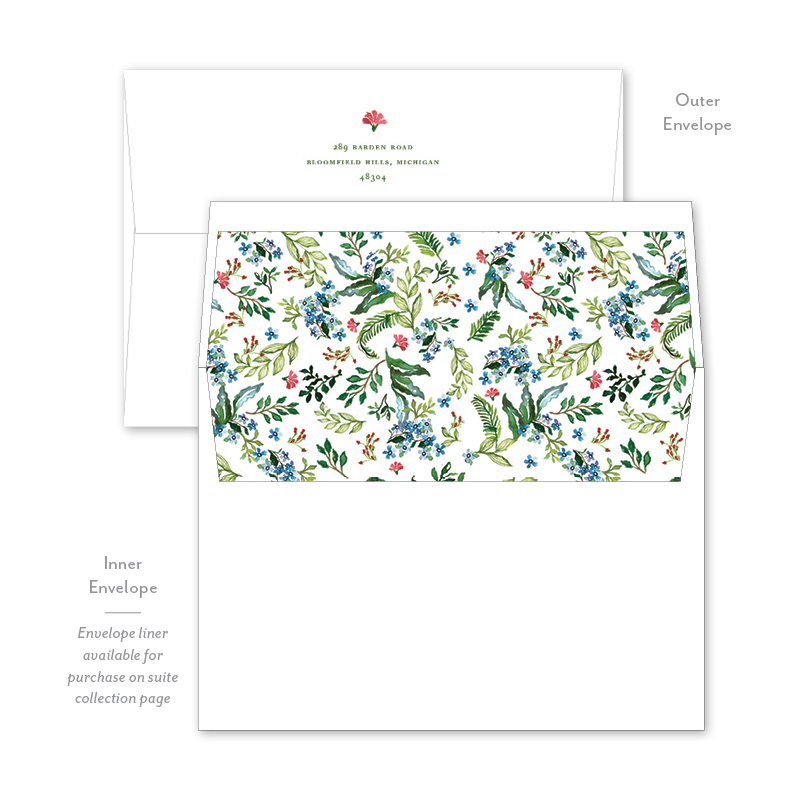 Each invitation comes with a blank inner and outer envelope and return address printing on the outer envelope flap. Envelope liner and recipient address printing for each envelope may be purchased for an additional cost on the main collection page.