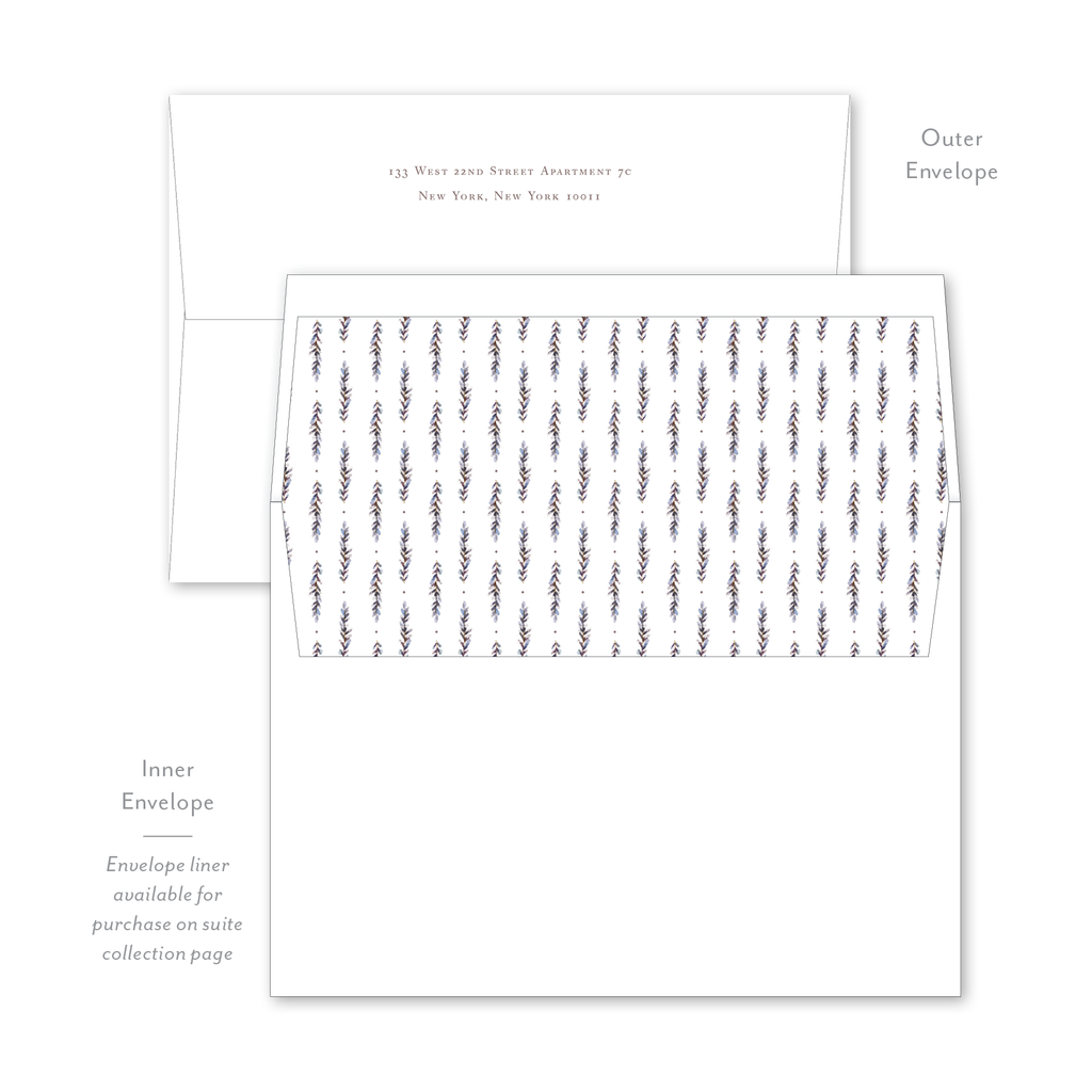 Each invitation comes with an inner and outer envelope and return address printing on the outer envelope flap. Envelope liner may be purchased for an additional cost on the main collection page.