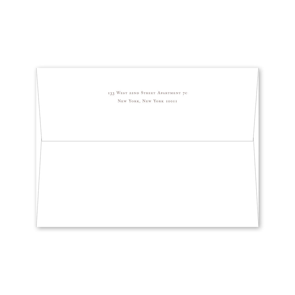 Each invitation comes with a blank inner and outer envelope and return address printing on the outer envelope flap. Envelope liner and recipient address printing for each envelope may be purchased for an additional cost on the main collection page.