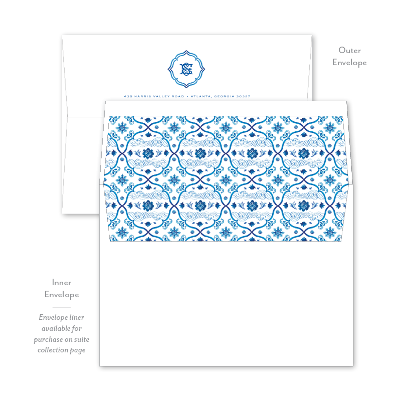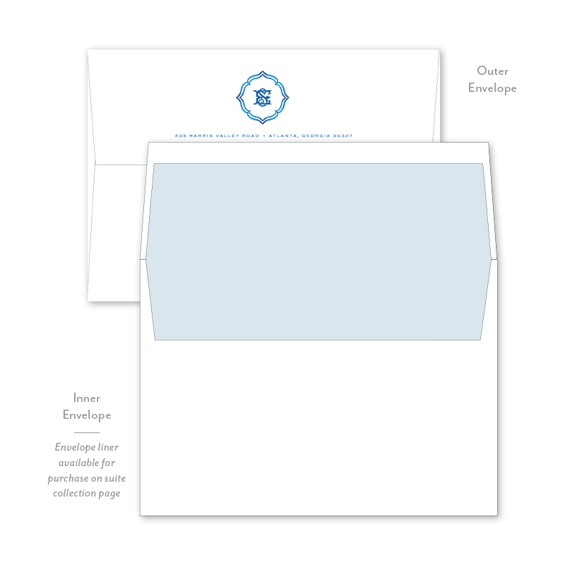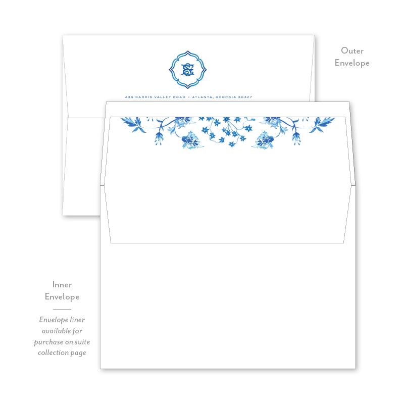 Each invitation comes with an inner and outer envelope and return address printing on the outer envelope flap. Envelope liner may be purchased for an additional cost on the main collection page.