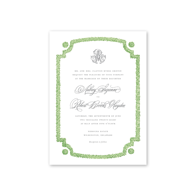 Each invitation comes with a blank inner and outer envelope and return address printing on the outer envelope flap. Envelope liner and recipient address printing for each envelope may be purchased for an additional cost on the main collection page.