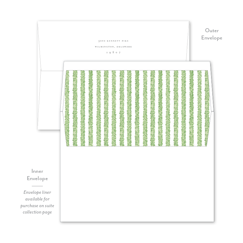 Each invitation comes with an inner and outer envelope and return address printing on the outer envelope flap. Envelope liner may be purchased for an additional cost on the main collection page.