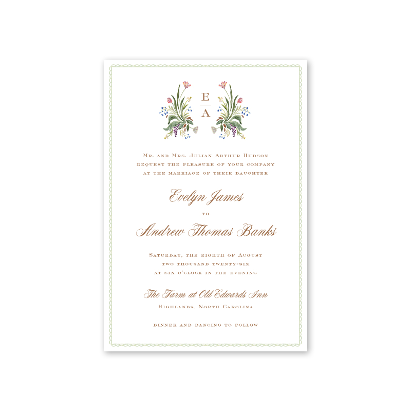 Each invitation comes with a blank inner and outer envelope and return address printing on the outer envelope flap. Envelope liner and recipient address printing for each envelope may be purchased for an additional cost on the main collection page.