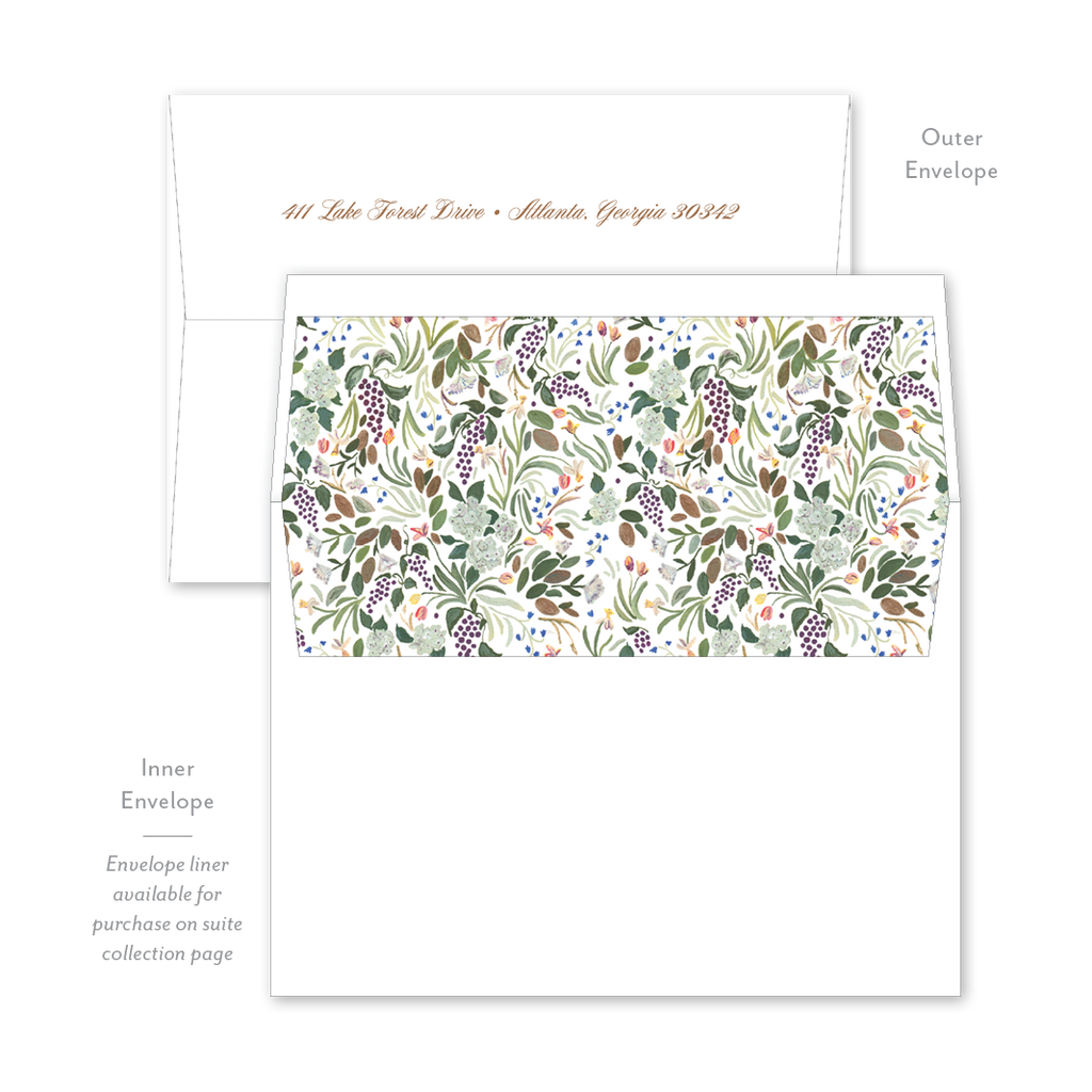 Each invitation comes with an inner and outer envelope and return address printing on the outer envelope flap. Envelope liner may be purchased for an additional cost on the main collection page.