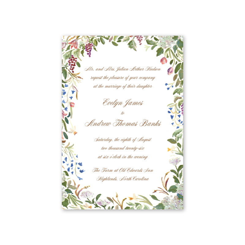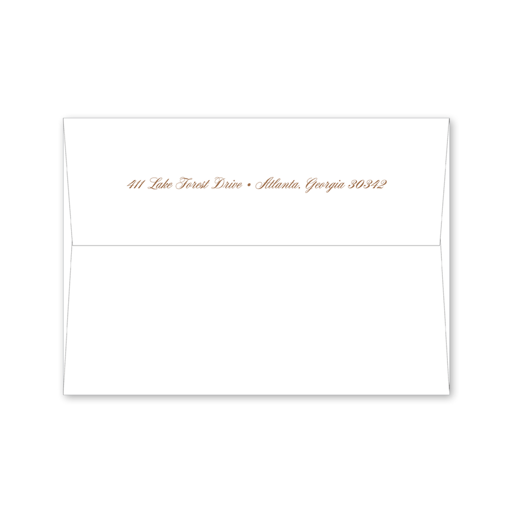 Each invitation comes with a blank inner and outer envelope and return address printing on the outer envelope flap. Envelope liner and recipient address printing for each envelope may be purchased for an additional cost on the main collection page.