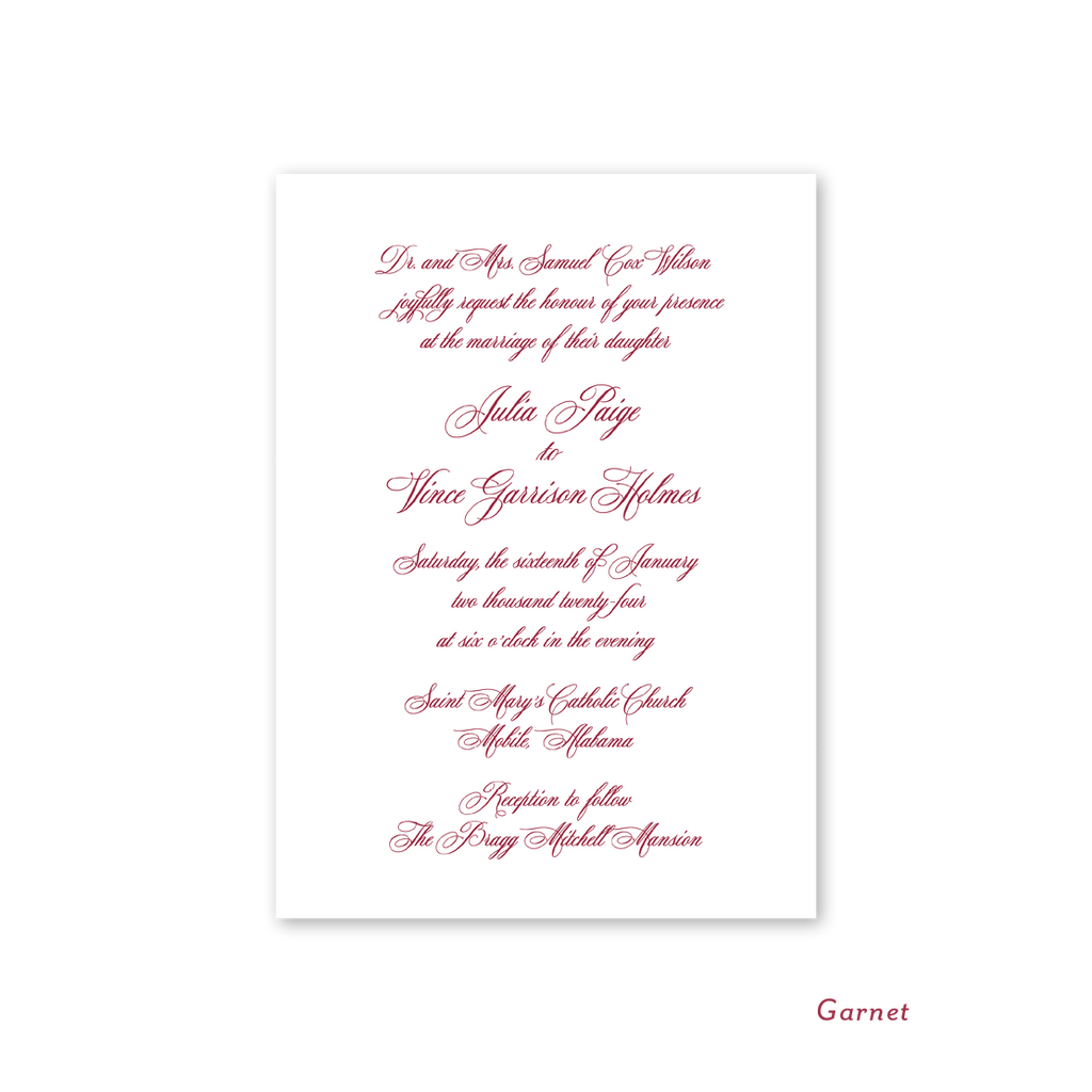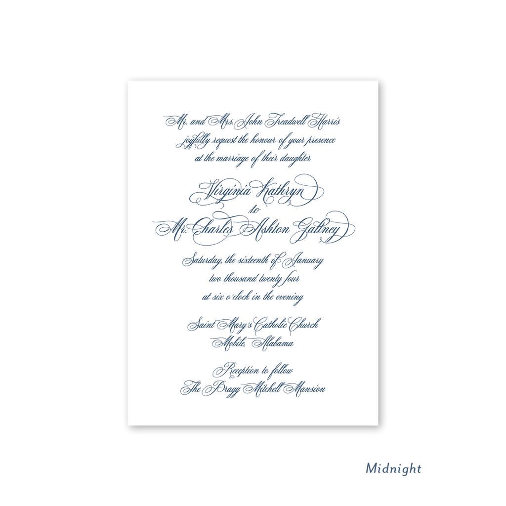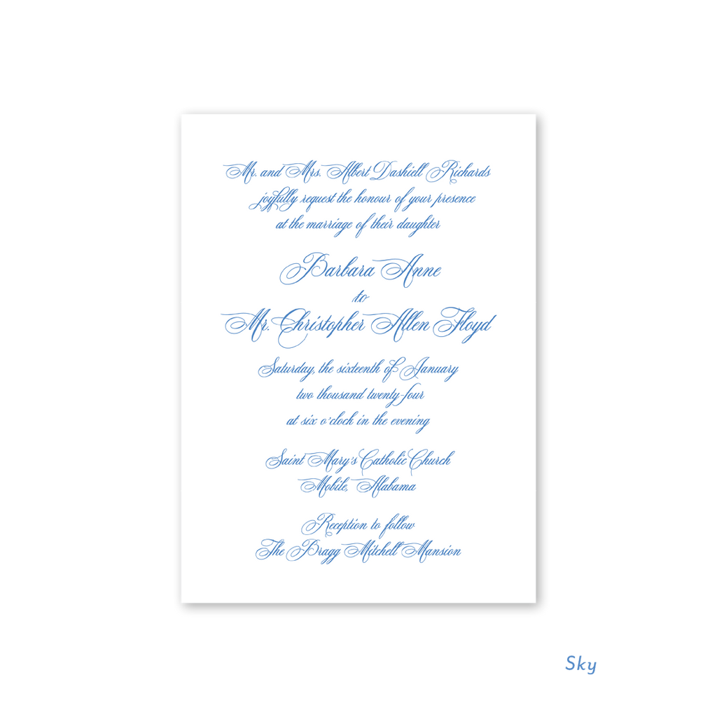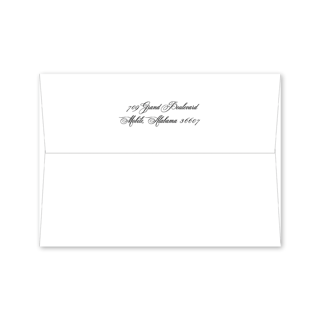Each invitation comes with a blank inner and outer envelope and return address printing on the outer envelope flap. Envelope liner and recipient address printing for each envelope may be purchased for an additional cost on the main collection page.