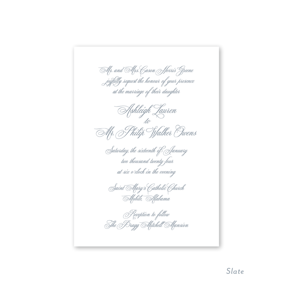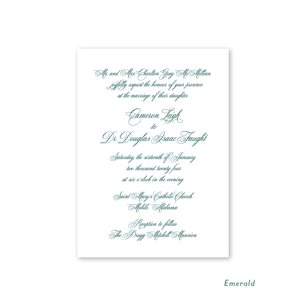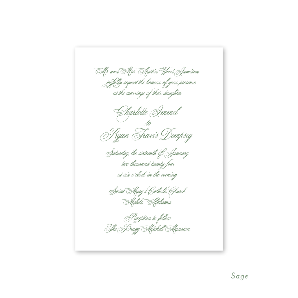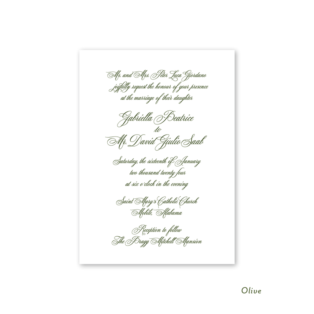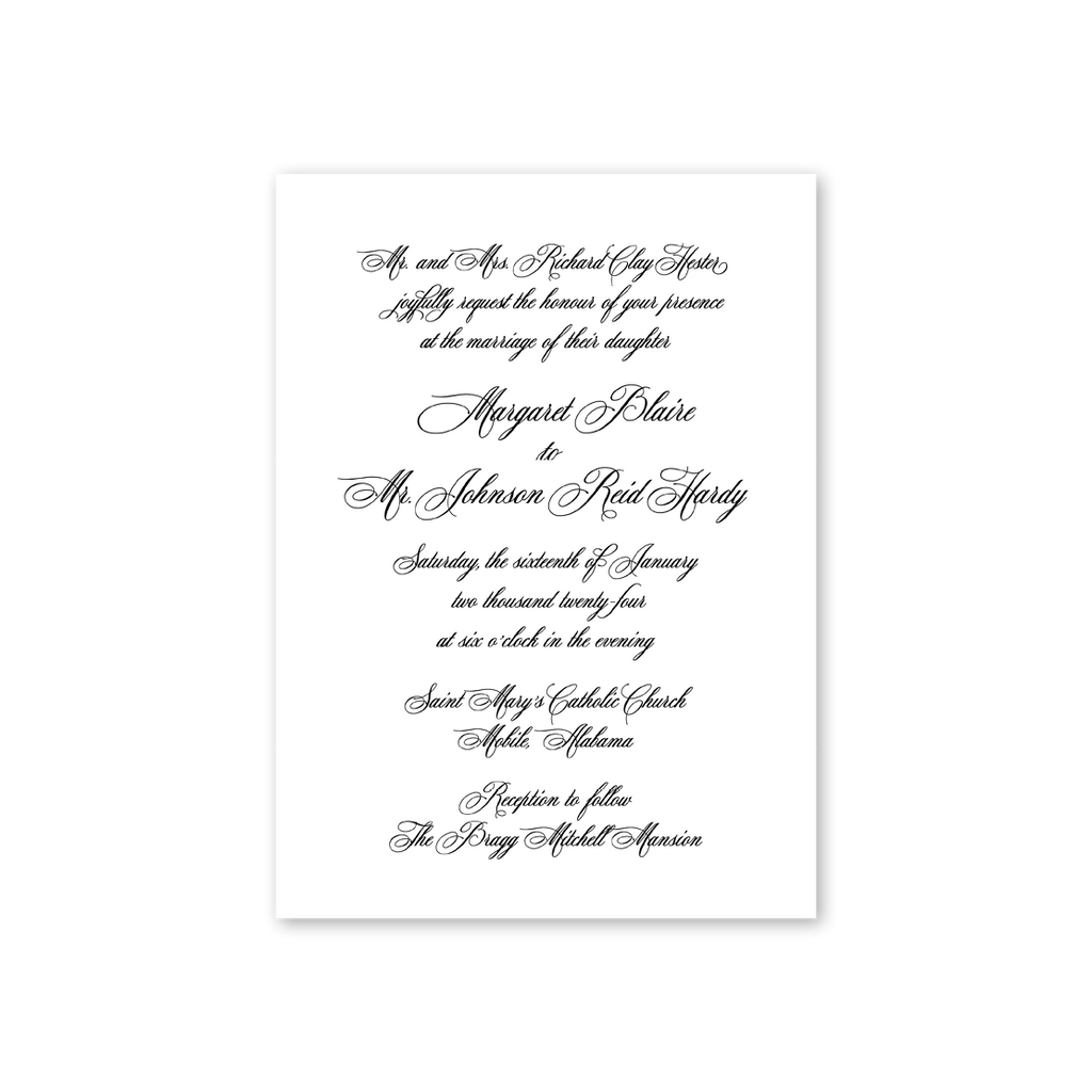 Each invitation comes with a blank inner and outer envelope and return address printing on the outer envelope flap. Envelope liner and recipient address printing for each envelope may be purchased for an additional cost on the main collection page.