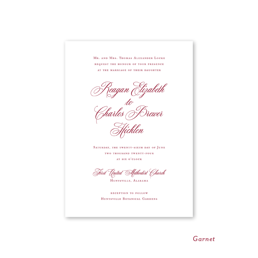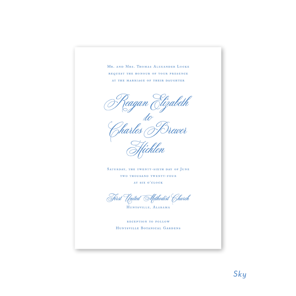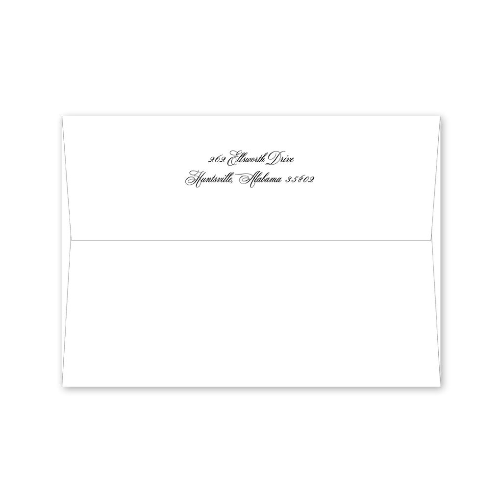 Each invitation comes with a blank inner and outer envelope and return address printing on the outer envelope flap. Envelope liner and recipient address printing for each envelope may be purchased for an additional cost on the main collection page.
