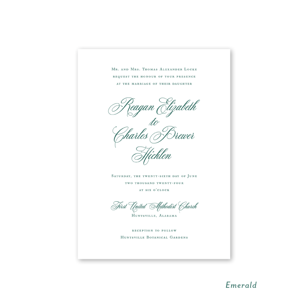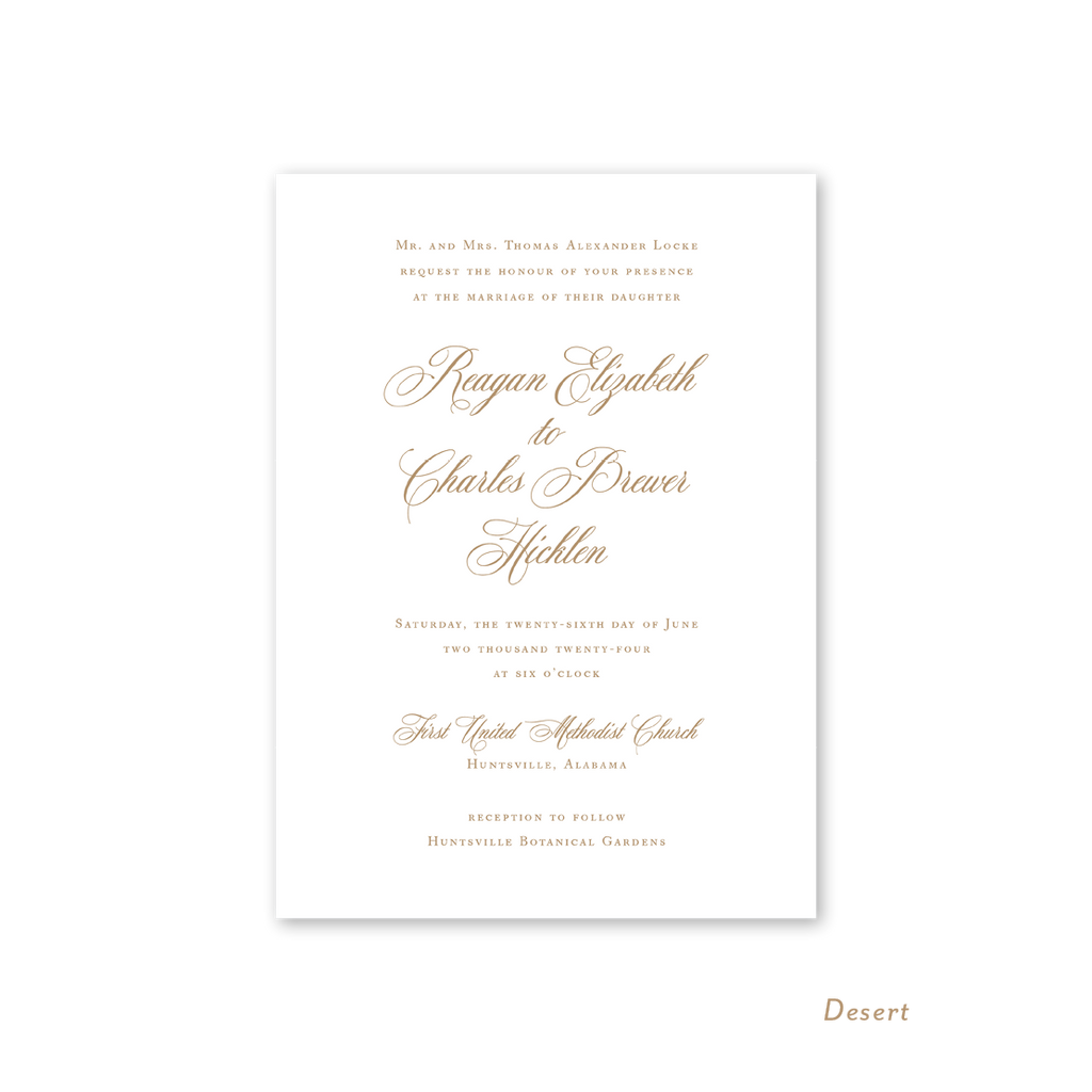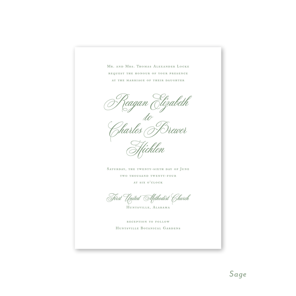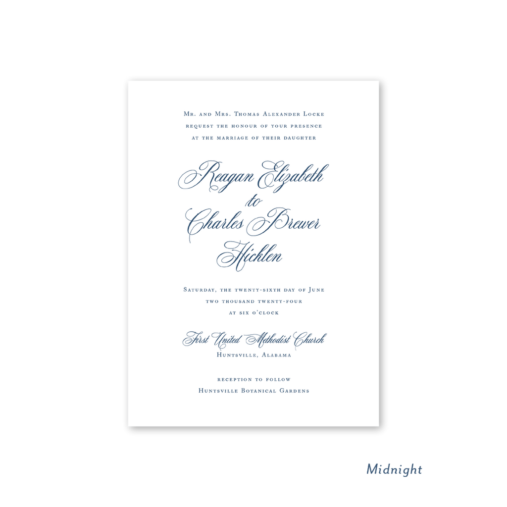 Each invitation comes with a blank inner and outer envelope and return address printing on the outer envelope flap. Envelope liner and recipient address printing for each envelope may be purchased for an additional cost on the main collection page.