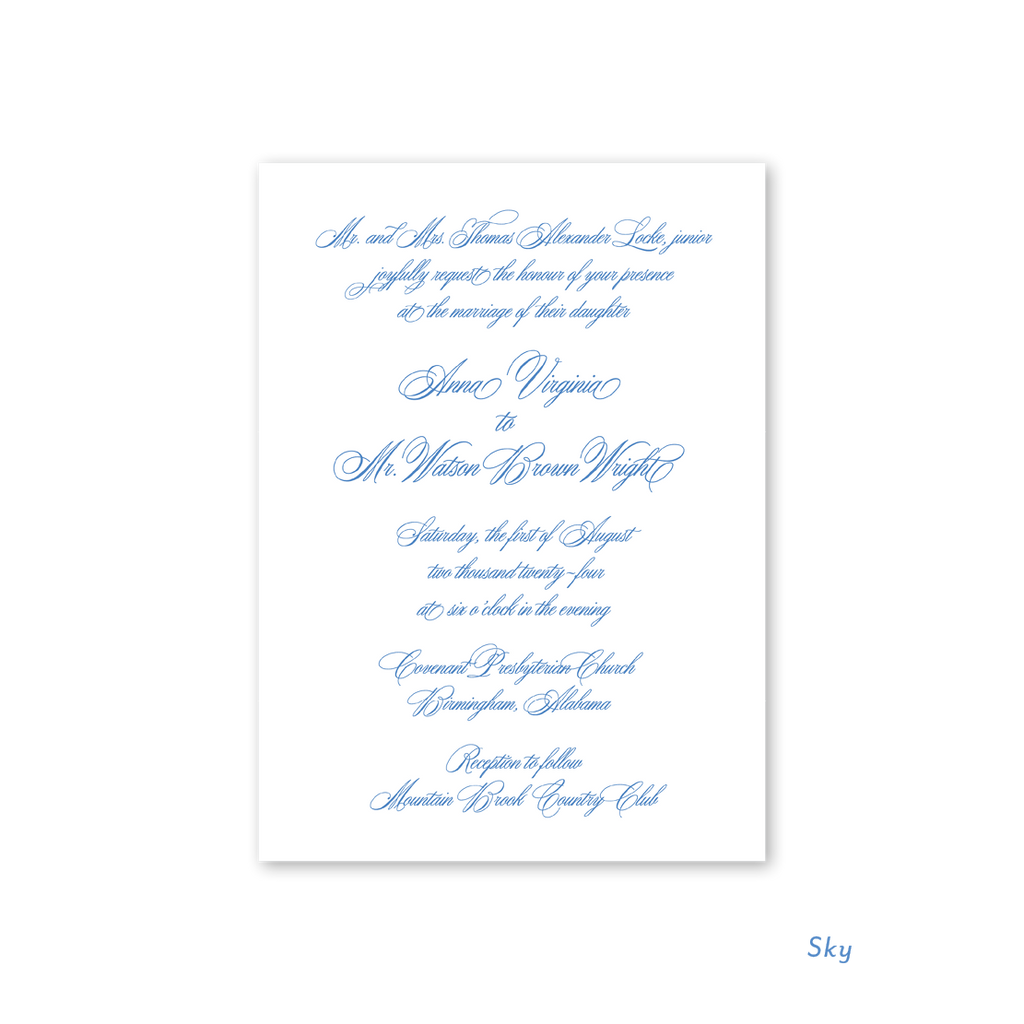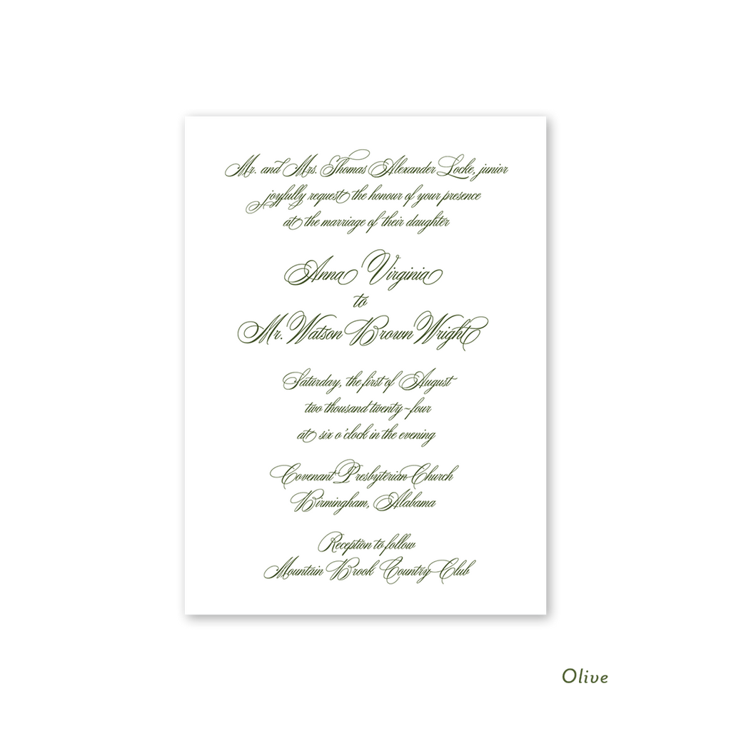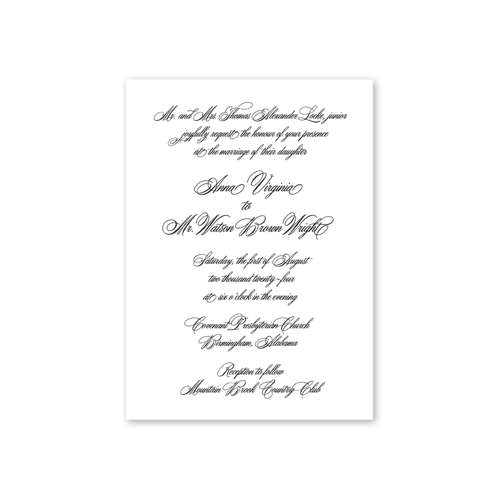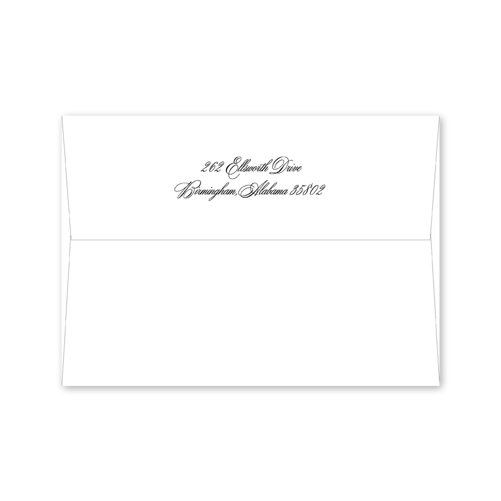 Each invitation comes with a blank inner and outer envelope and return address printing on the outer envelope flap. Envelope liner and recipient address printing for each envelope may be purchased for an additional cost on the main collection page.