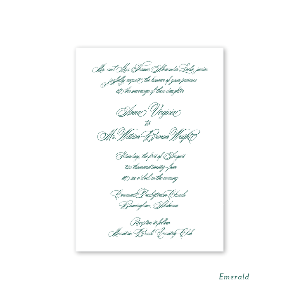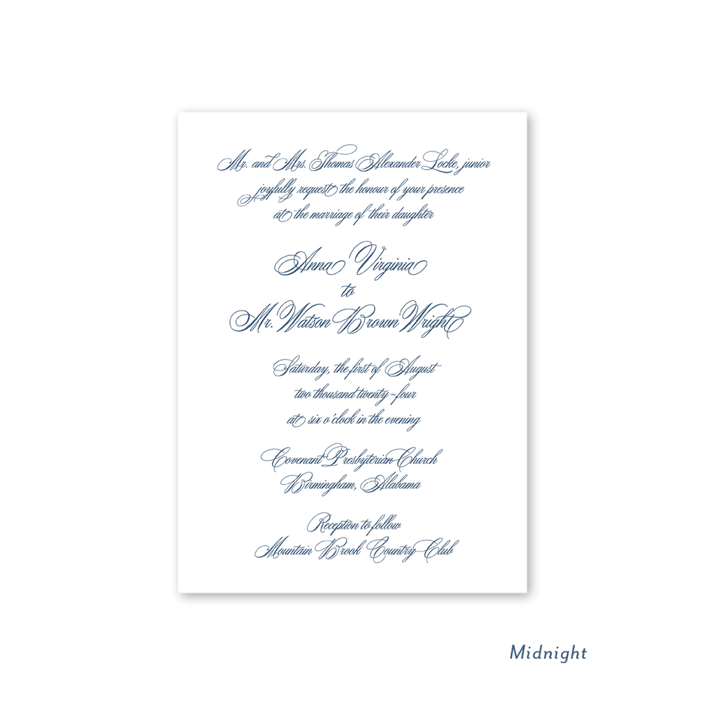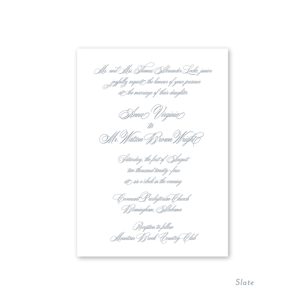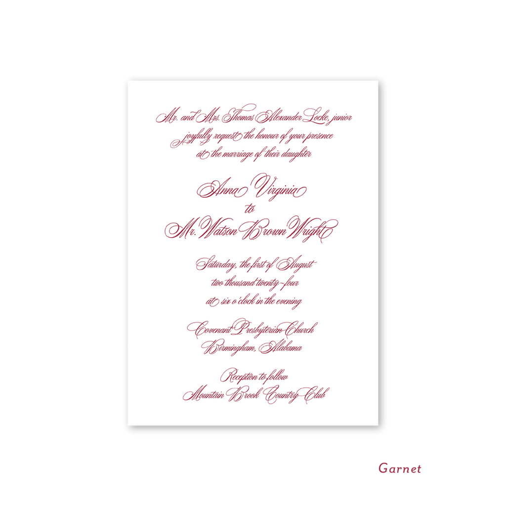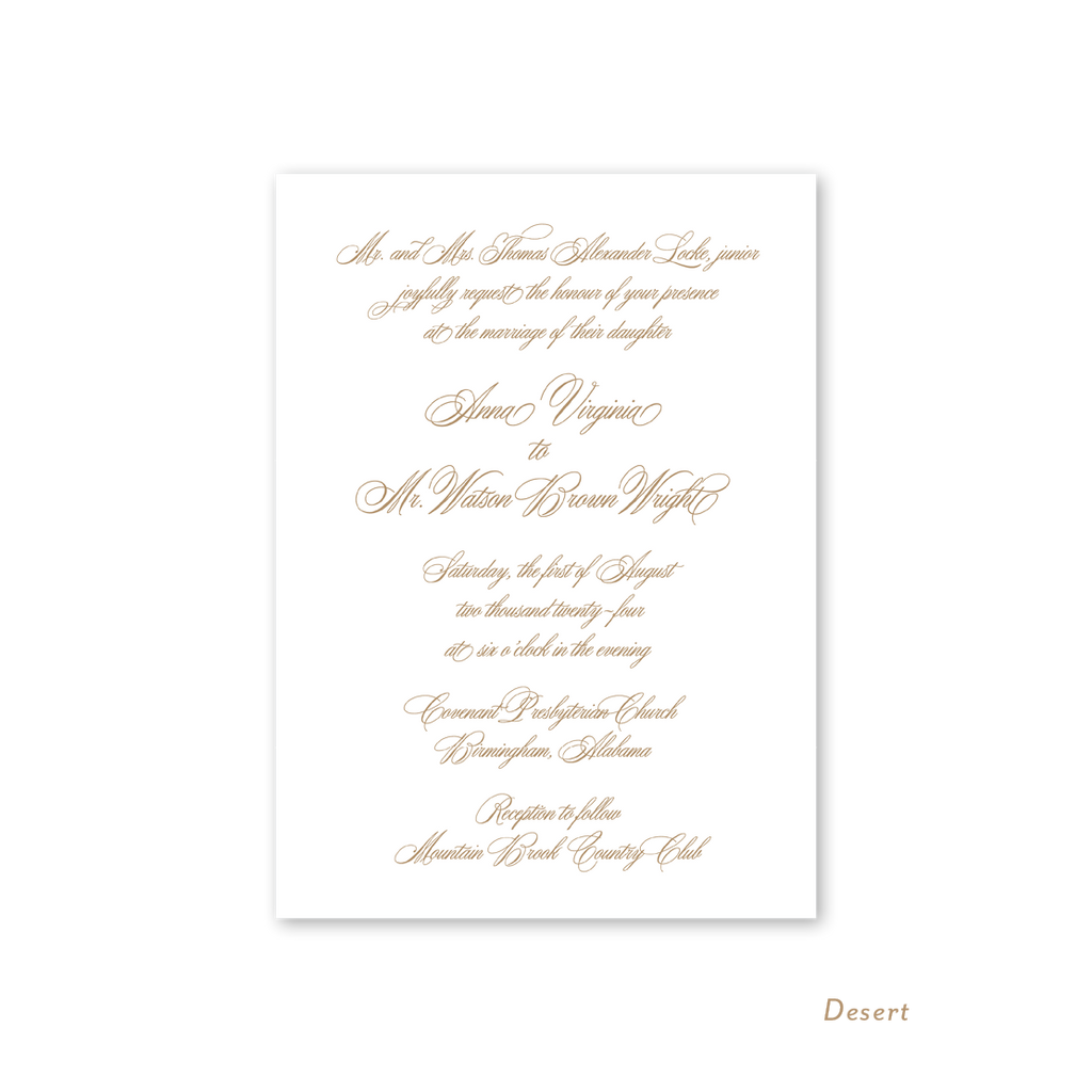 Each invitation comes with a blank inner and outer envelope and return address printing on the outer envelope flap. Envelope liner and recipient address printing for each envelope may be purchased for an additional cost on the main collection page.