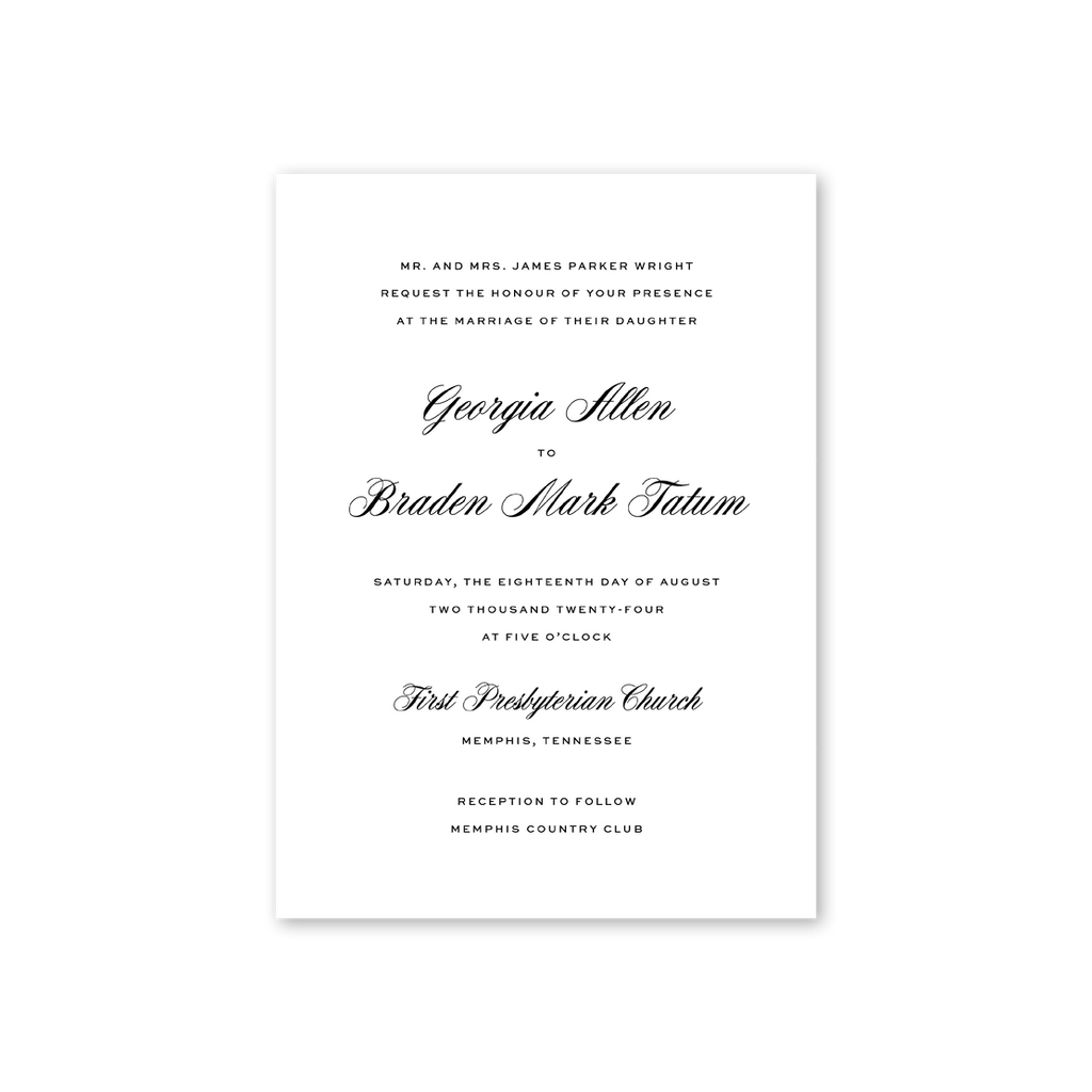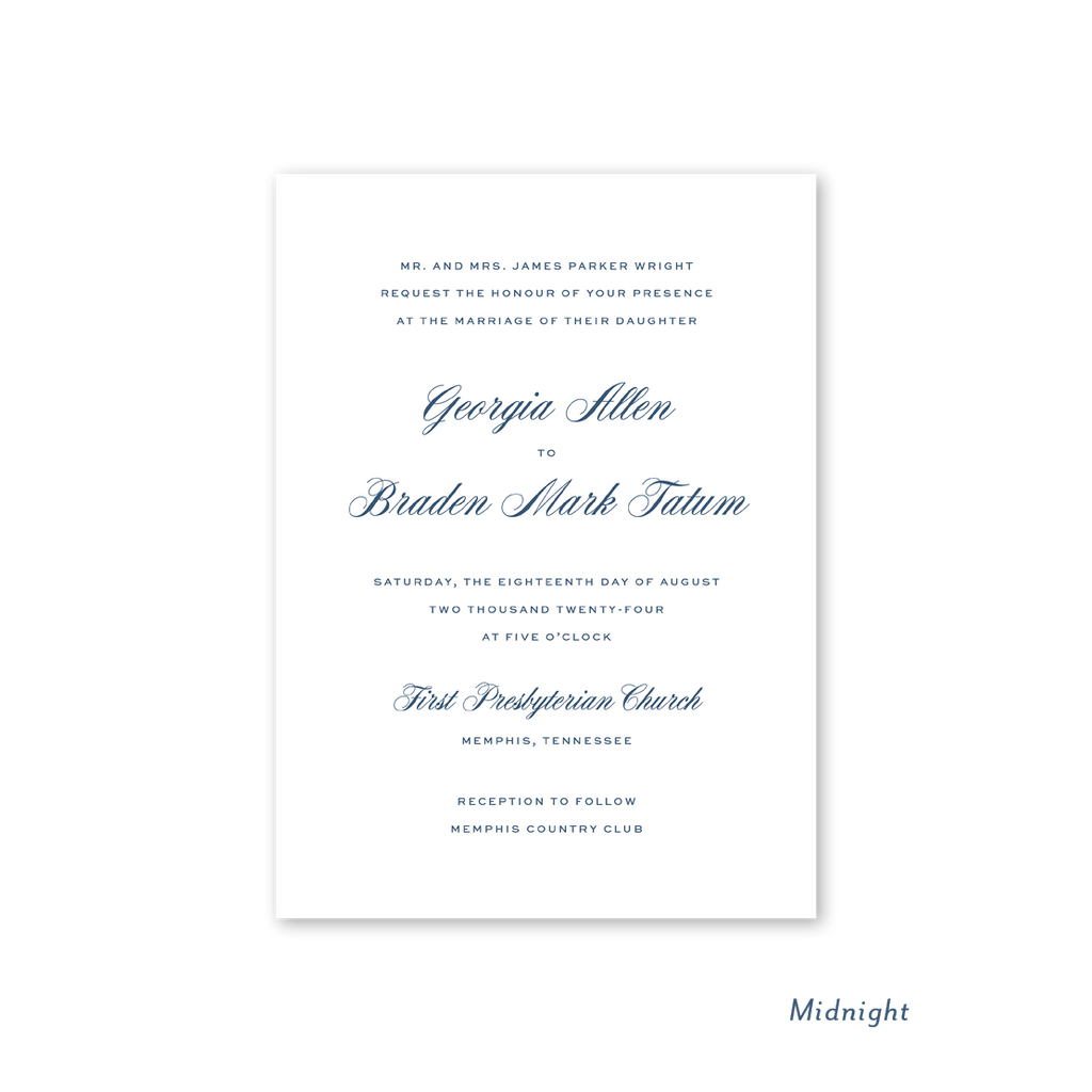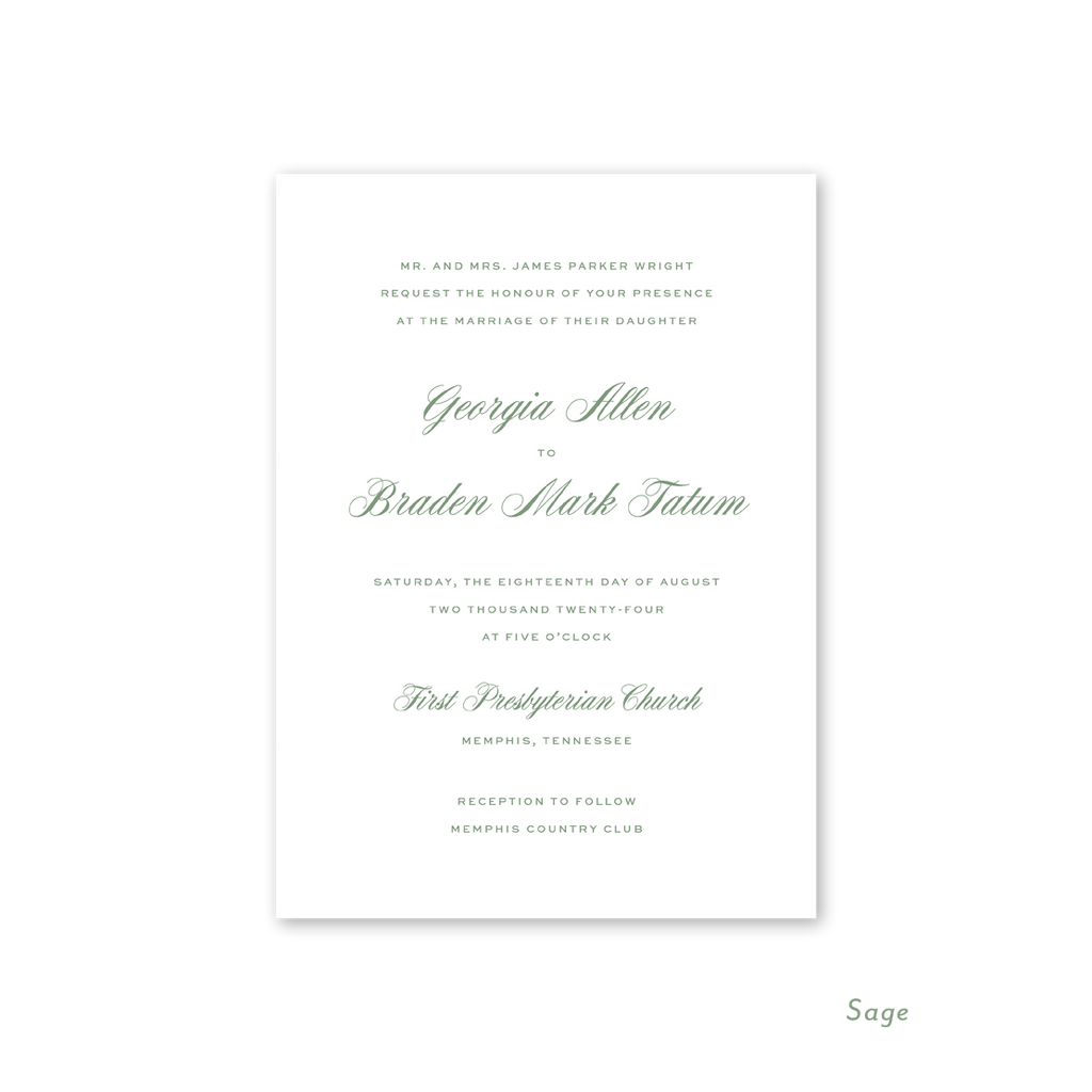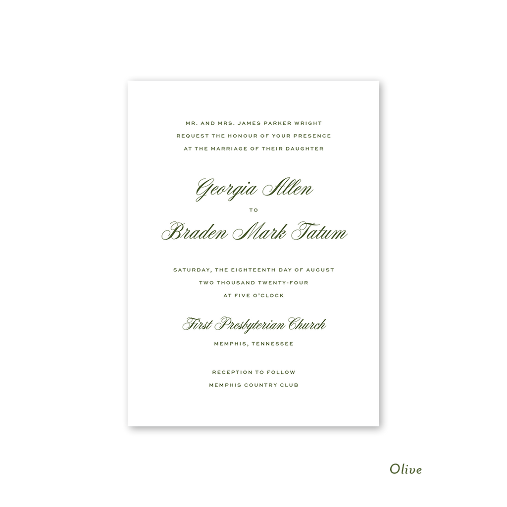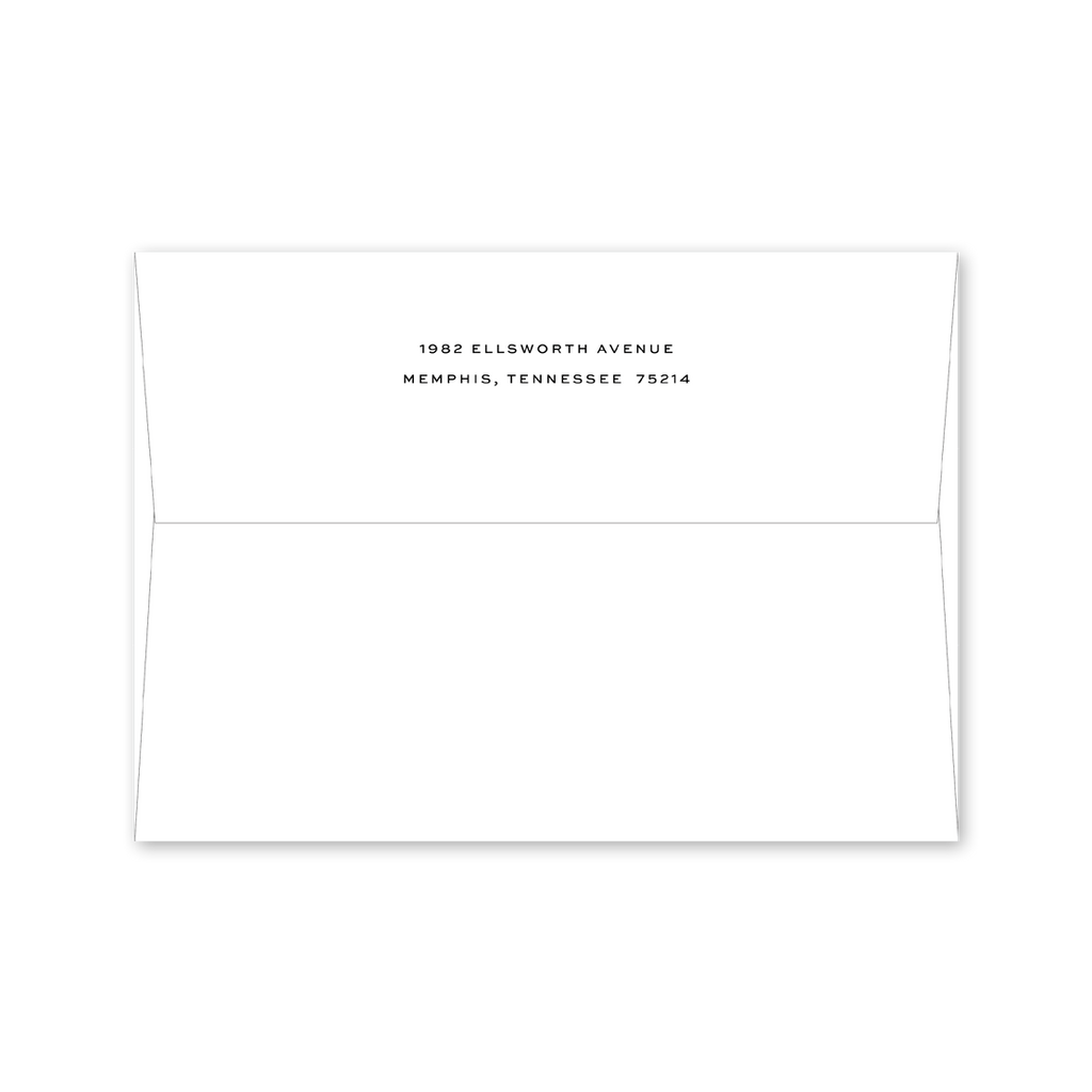 Each invitation comes with a blank inner and outer envelope and return address printing on the outer envelope flap. Envelope liner and recipient address printing for each envelope may be purchased for an additional cost on the main collection page.