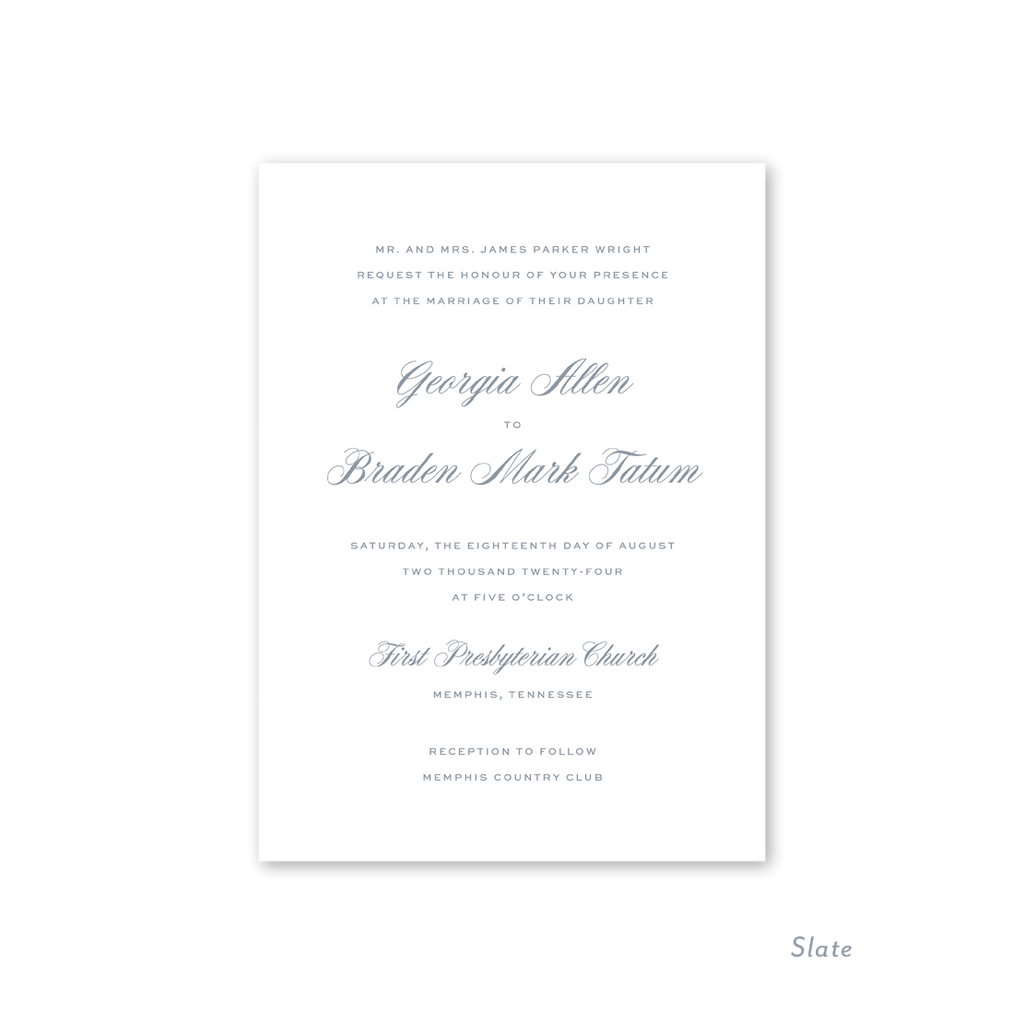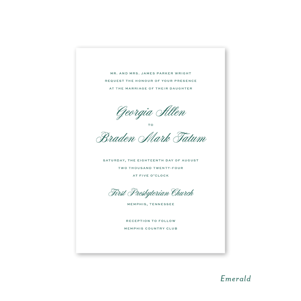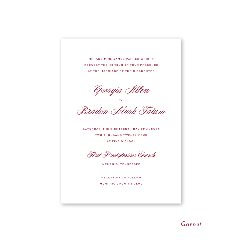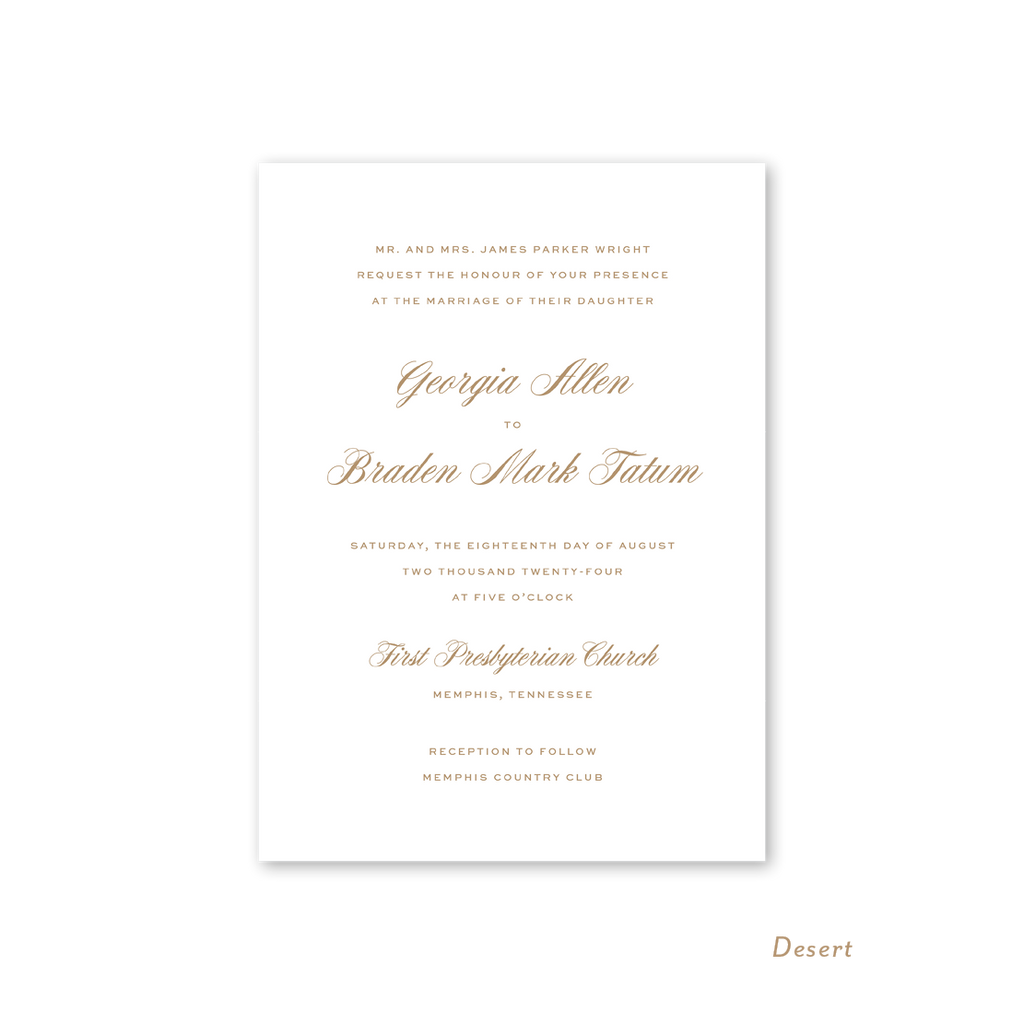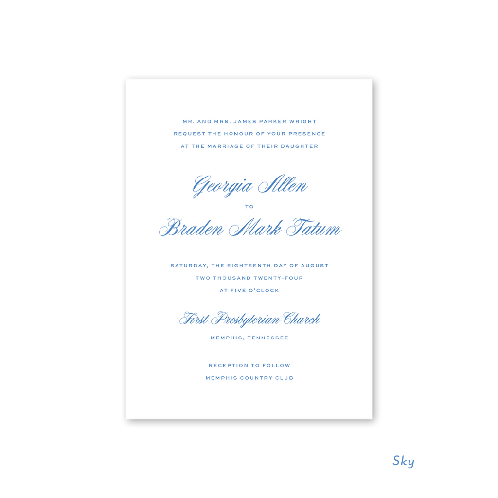 Each invitation comes with a blank inner and outer envelope and return address printing on the outer envelope flap. Envelope liner and recipient address printing for each envelope may be purchased for an additional cost on the main collection page.