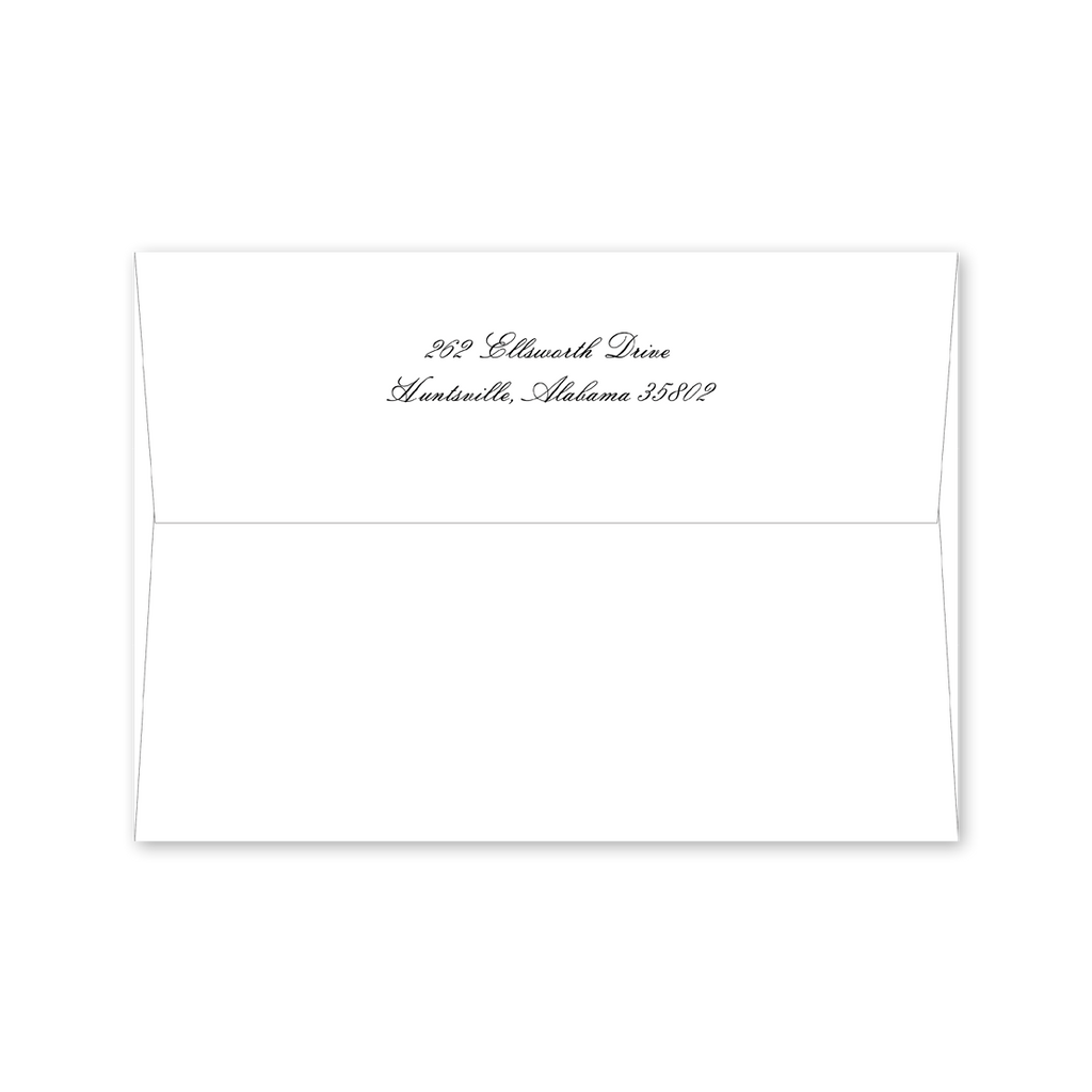 Each invitation comes with a blank inner and outer envelope and return address printing on the outer envelope flap. Envelope liner and recipient address printing for each envelope may be purchased for an additional cost on the main collection page.