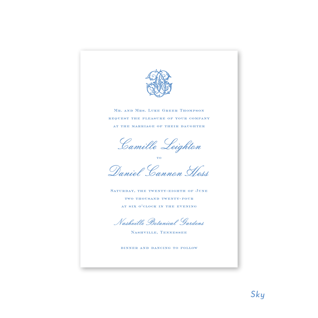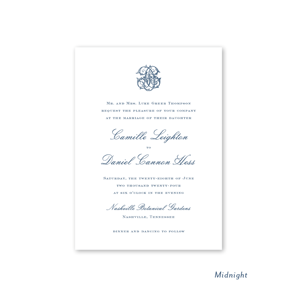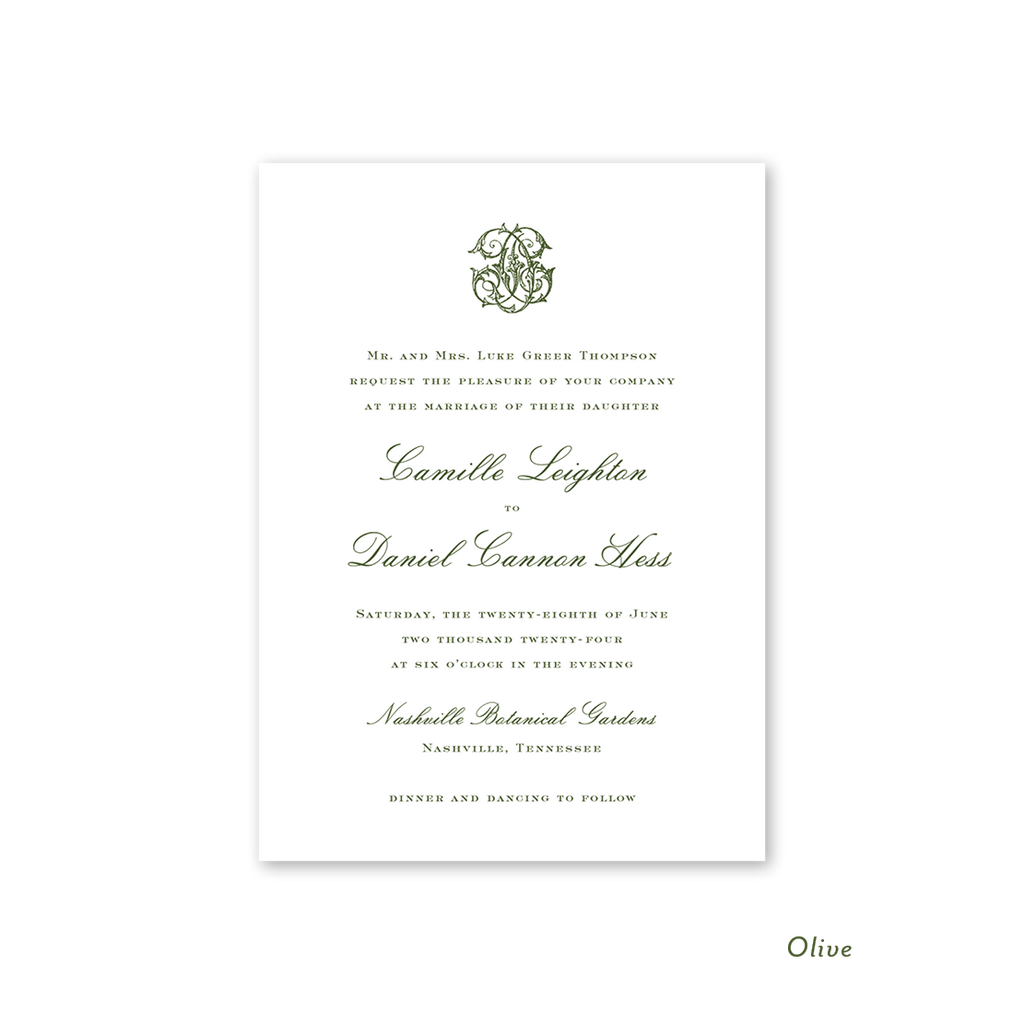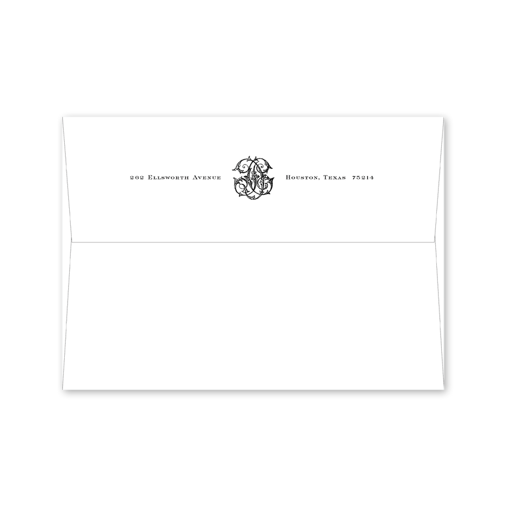 Each invitation comes with a blank inner and outer envelope and return address printing on the outer envelope flap. Envelope liner and recipient address printing for each envelope may be purchased for an additional cost on the main collection page.