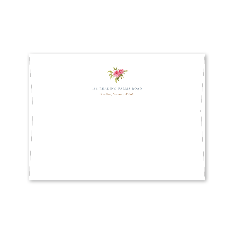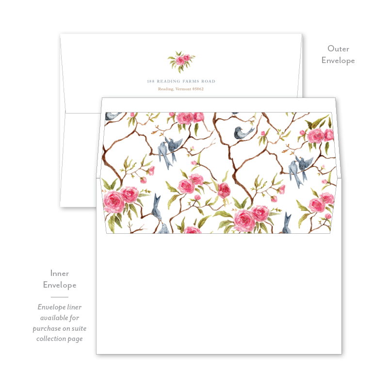Each invitation comes with a blank inner and outer envelope and return address printing on the outer envelope flap. Envelope liner and recipient address printing for each envelope may be purchased for an additional cost on the main collection page.