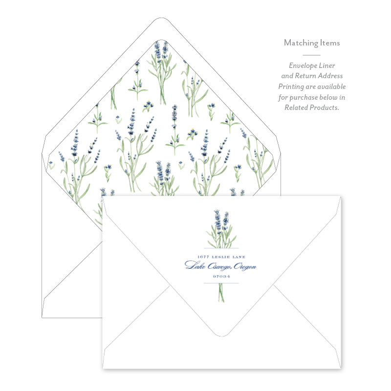 Each invitation comes with an inner and outer envelope and return address printing on the outer envelope flap. Envelope liner may be purchased for an additional cost on the main collection page.