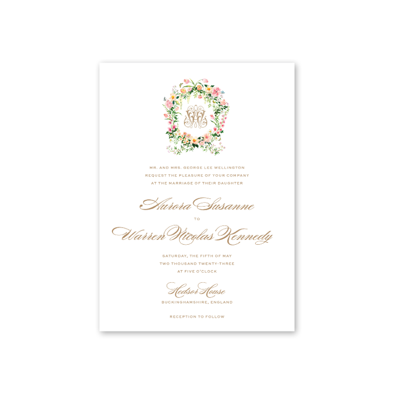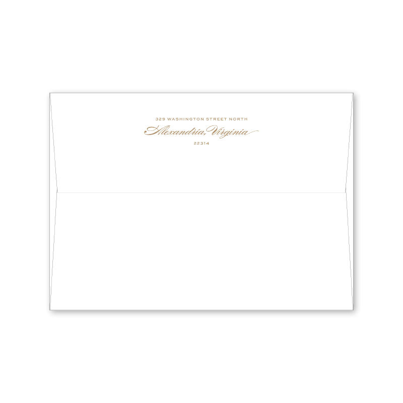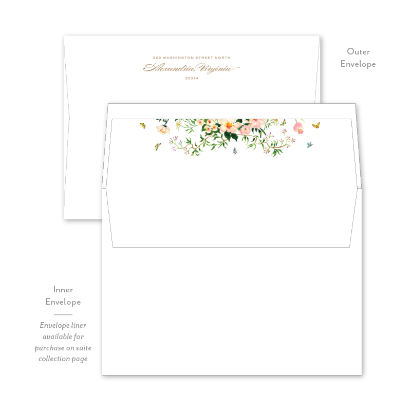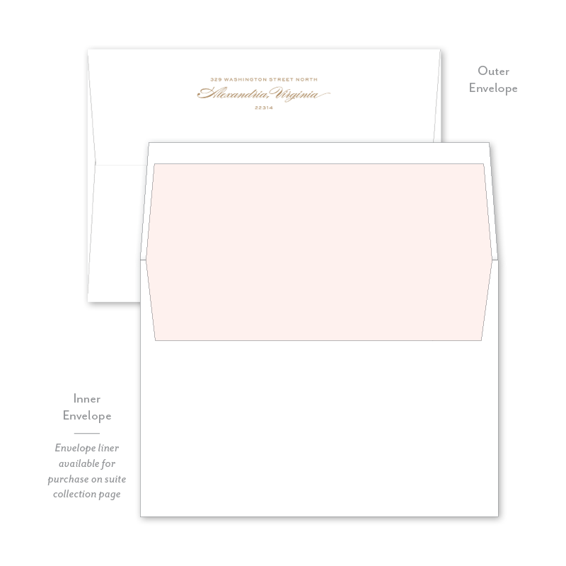 Each invitation comes with a blank inner and outer envelope and return address printing on the outer envelope flap. Envelope liner and recipient address printing for each envelope may be purchased for an additional cost on the main collection page.