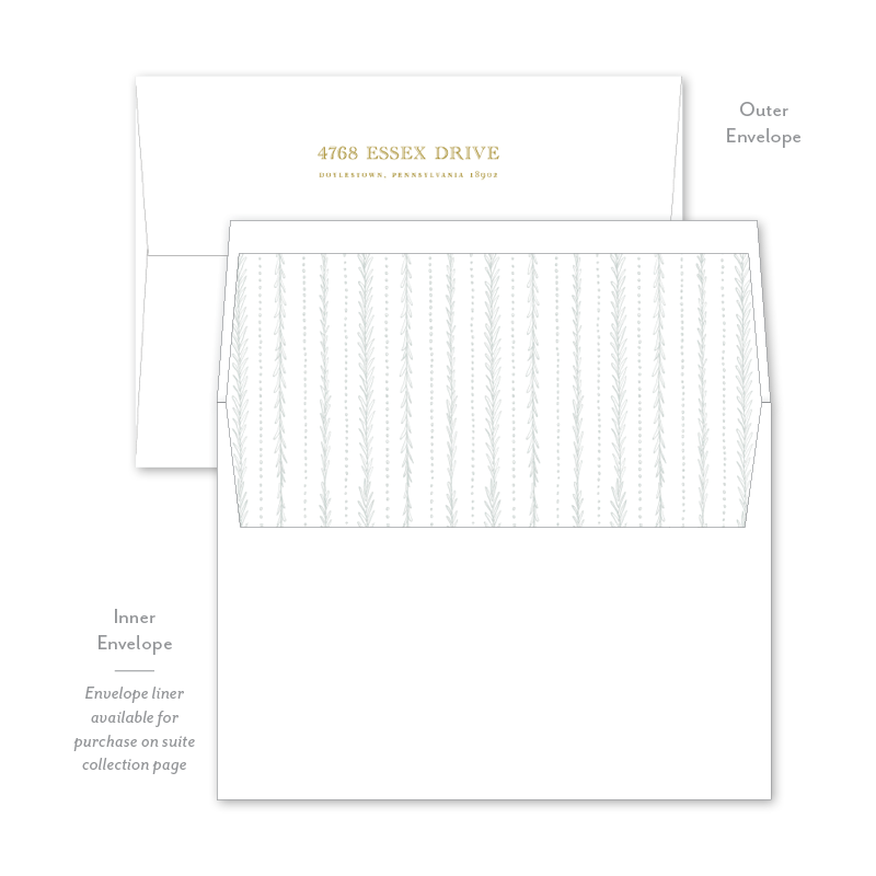 Each invitation comes with an inner and outer envelope and return address printing on the outer envelope flap. Envelope liner may be purchased for an additional cost on the main collection page.
