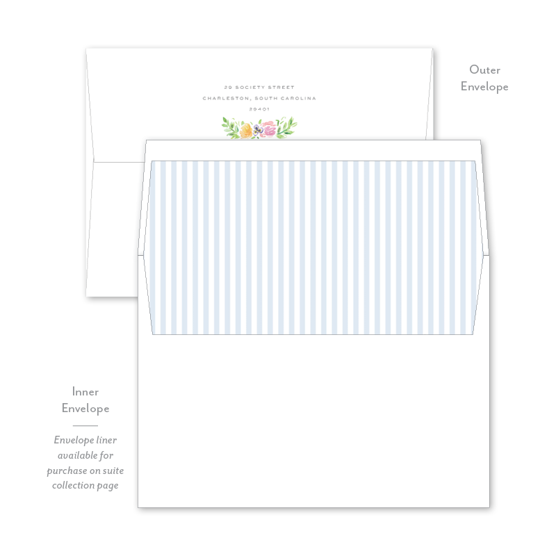 Each invitation comes with an inner and outer envelope and return address printing on the outer envelope flap. Envelope liner may be purchased for an additional cost on the main collection page.