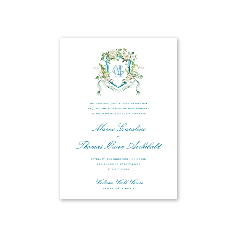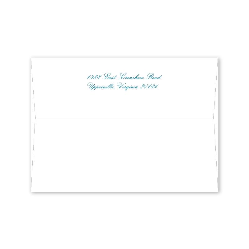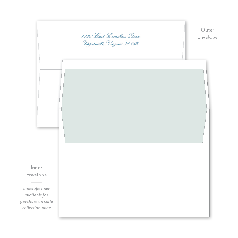 Each invitation comes with a blank inner and outer envelope and return address printing on the outer envelope flap. Envelope liner and recipient address printing for each envelope may be purchased for an additional cost on the main collection page.