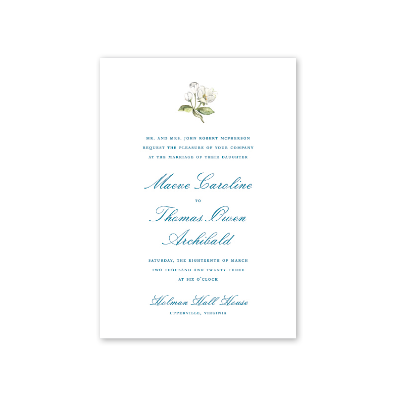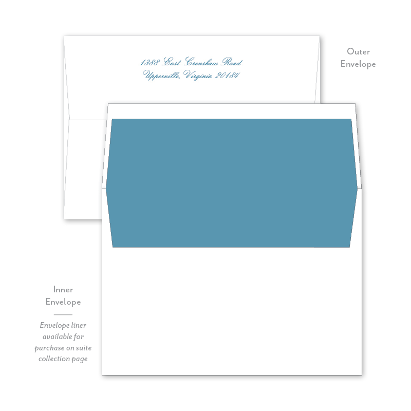 Each invitation comes with a blank inner and outer envelope and return address printing on the outer envelope flap. Envelope liner and recipient address printing for each envelope may be purchased for an additional cost on the main collection page.