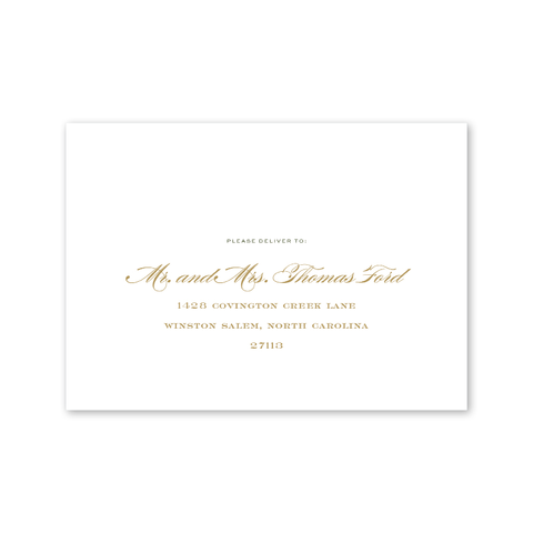 Each invitation comes with a blank inner and outer envelope and return address printing on the outer envelope flap. Envelope liner and recipient address printing for each envelope may be purchased for an additional cost on the main collection page.