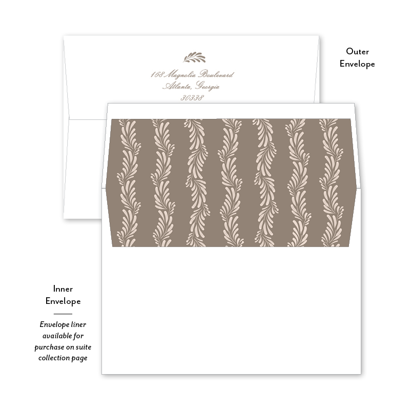 Each invitation comes with an inner and outer envelope and return address printing on the outer envelope flap. Envelope liner may be purchased for an additional cost on the main collection page.