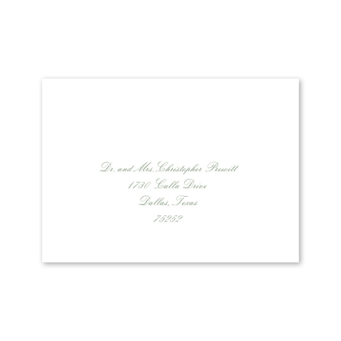 Each invitation comes with a blank inner and outer envelope and return address printing on the outer envelope flap. Envelope liner and recipient address printing for each envelope may be purchased for an additional cost on the main collection page.