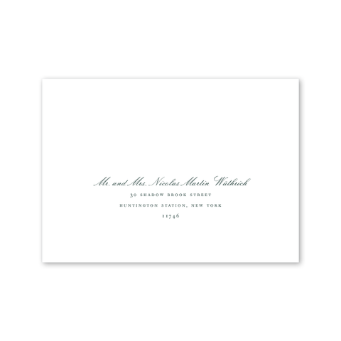Each invitation comes with a blank inner and outer envelope and return address printing on the outer envelope flap. Envelope liner and recipient address printing for each envelope may be purchased for an additional cost on the main collection page.