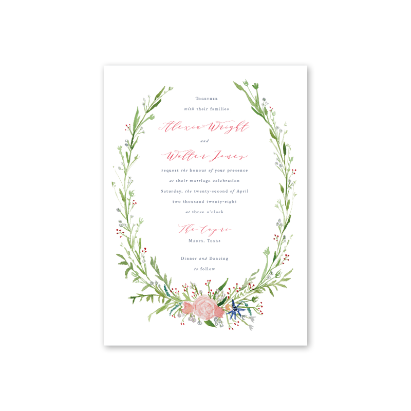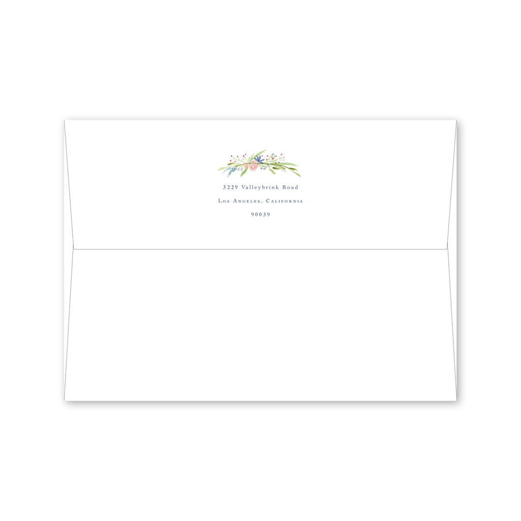 Each invitation comes with a blank inner and outer envelope and return address printing on the outer envelope flap.  Envelope liner and recipient address printing for each envelope may be purchased for an additional cost on the main collection page.