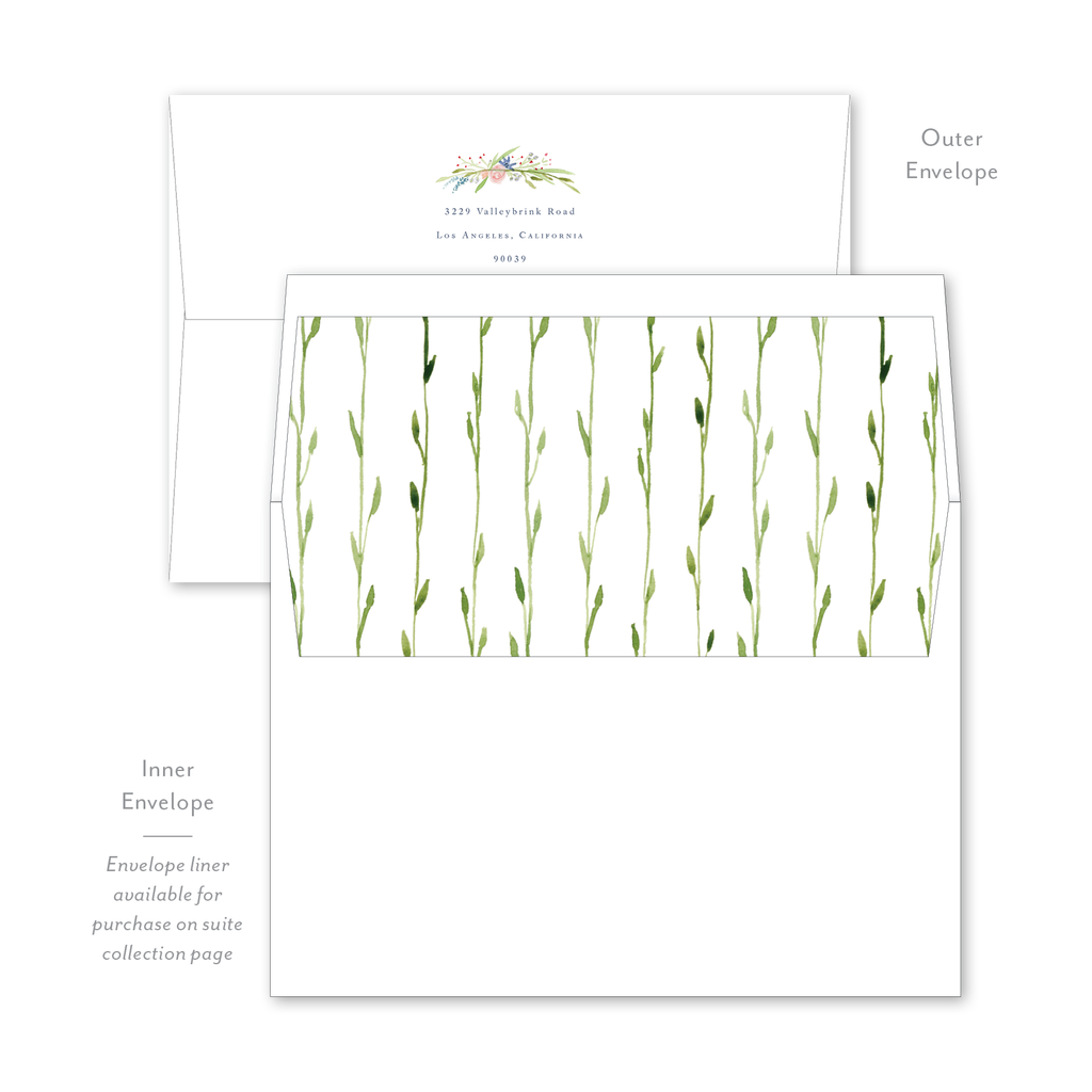 Each invitation comes with an inner and outer envelope and return address printing on the outer envelope flap.  Envelope liner may be purchased for an additional cost on the main collection page.