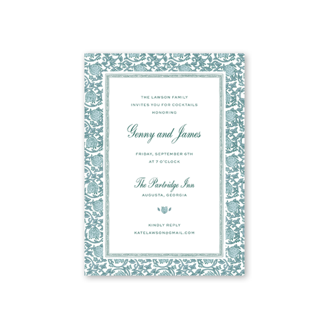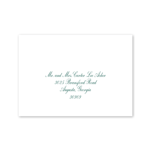 Each invitation comes with a blank inner and outer envelope and return address printing on the outer envelope flap. Envelope liner and recipient address printing for each envelope may be purchased for an additional cost on the main collection page.