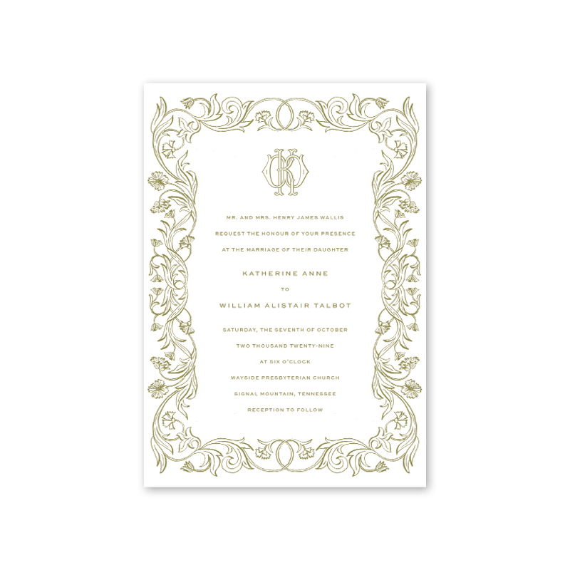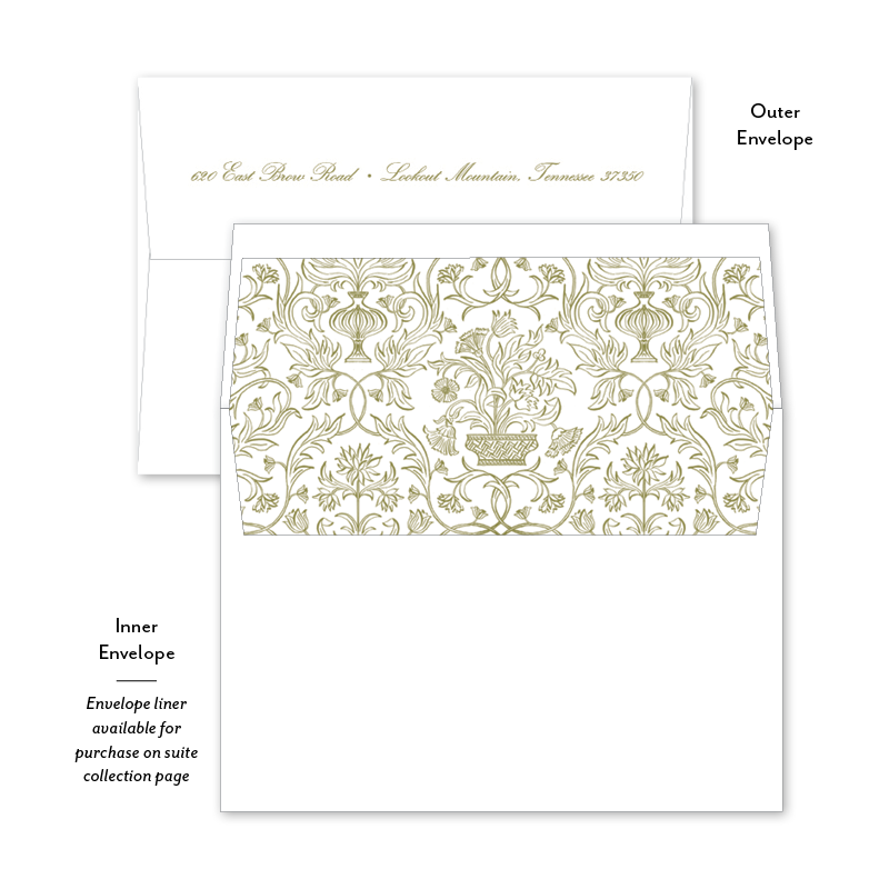 Each invitation comes with a blank inner and outer envelope and return address printing on the outer envelope flap.  Envelope liner and recipient address printing for each envelope may be purchased for an additional cost on the main collection page.
