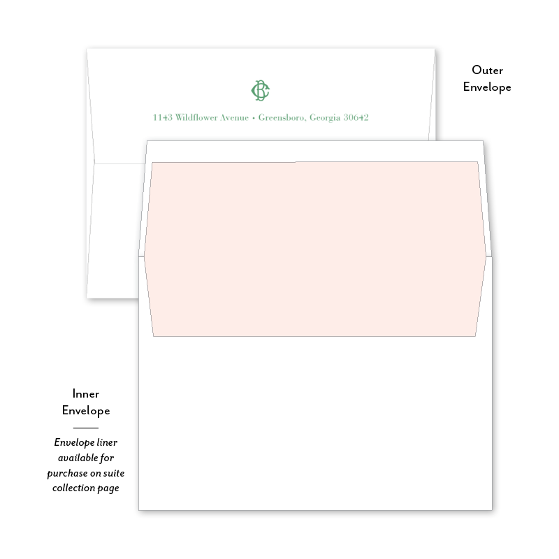 Each invitation comes with an inner and outer envelope and return address printing on the outer envelope flap. Envelope liner may be purchased for an additional cost on the main collection page.