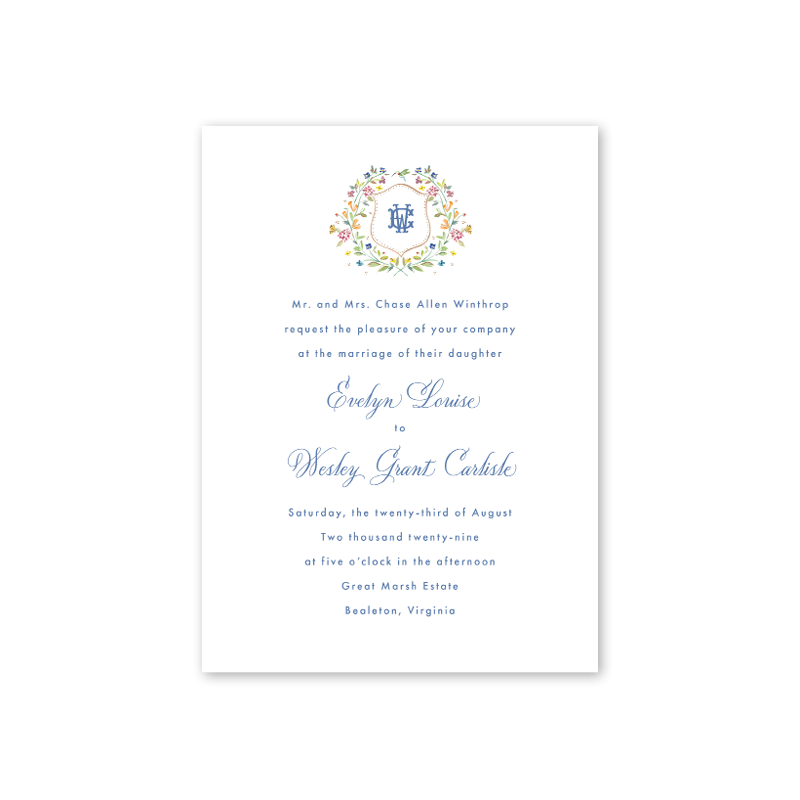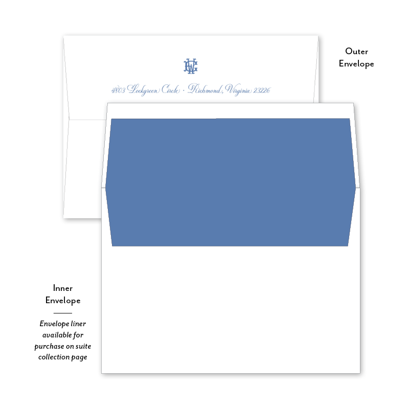 Each invitation comes with a blank inner and outer envelope and return address printing on the outer envelope flap.  Envelope liner and recipient address printing for each envelope may be purchased for an additional cost on the main collection page.