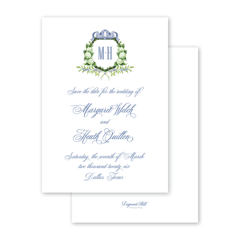 Select your order quantity from the dropdown menu below and check your total. Enter the text for your Save the Date in the “Note” box below. Click Add to Cart. Your wording does not have to match the sample product wording and can be customized for your Save the Date. You will receive a proof notification via email and text message within 3 to 5 business days.If your Save the Date includes a photo, please email a high resolution image along with your order number to weddings@dogwood-hill.com.