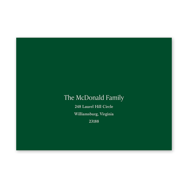 Enter your order quantity and check your total. Please enter your address EXACTLY like you want it printed on your envelope in the "Note" box below. Click Add to Cart. You will not receive a proof during the holidays (September 15 – December 31), unless your accompanying card requires a proof. If you do not include your address in the "Note" box or email it to Customer Service within 24 hours of placing your order, we will use your shipping address as the printed return address on your envelope. | /