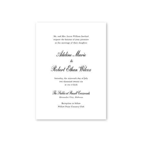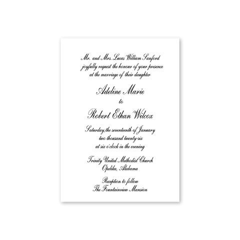 Each invitation comes with a blank inner and outer envelope and return address printing on the outer envelope flap.  Envelope liner and recipient address printing for each envelope may be purchased for an additional cost on the main collection page.